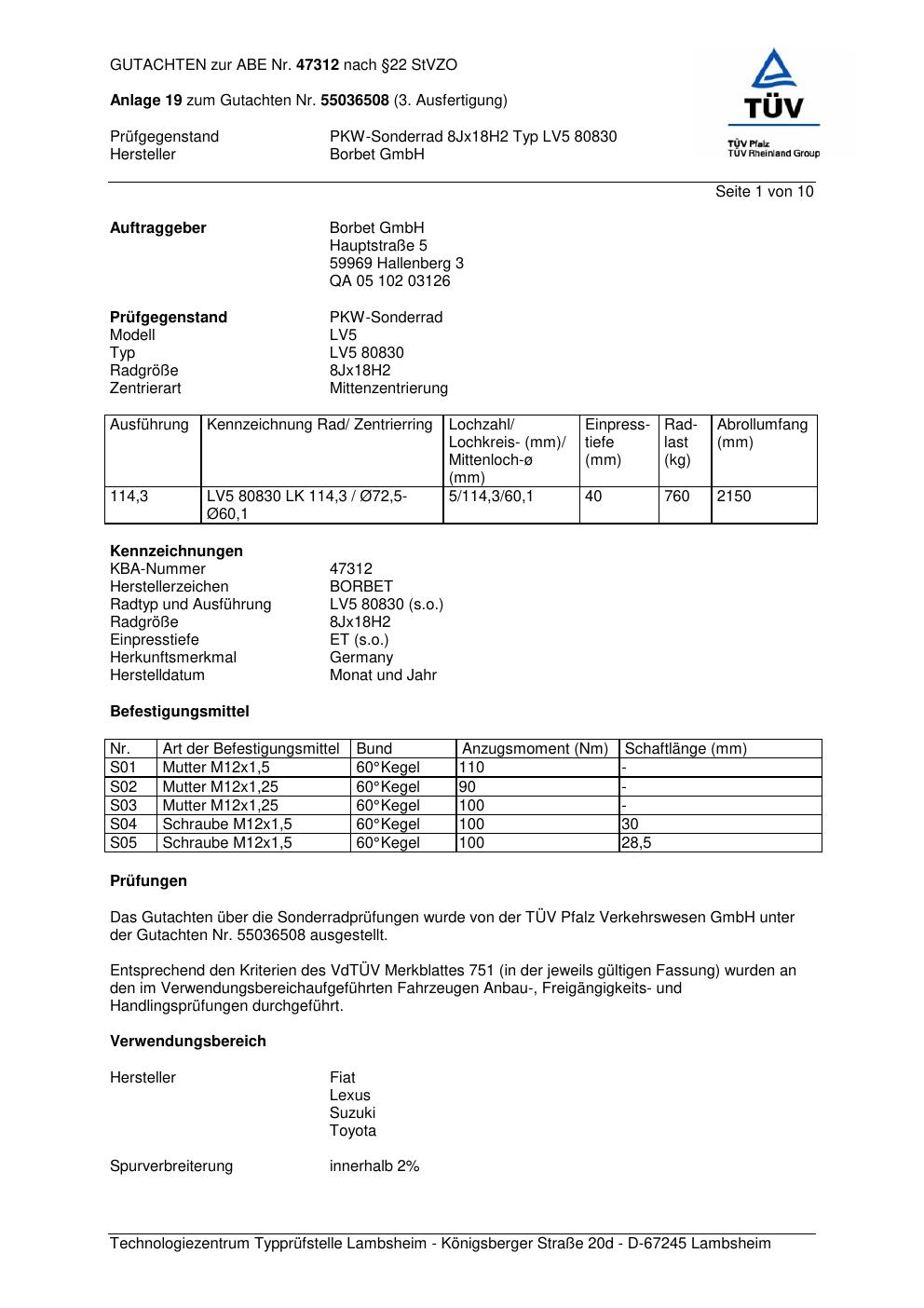 Dieses Gutachten (abe) bezieht sich auf die Alufelge Borbet LV5 80830 in der Ausführung 8Jx18 ET 0, Mittenloch 0 mm (KBA 47312). Im PDF findest du typischerweise zulässige Reifengrößen, Auflagen/Anbauhinweise und – je nach Dokument – Hinweise zur Eintragung.