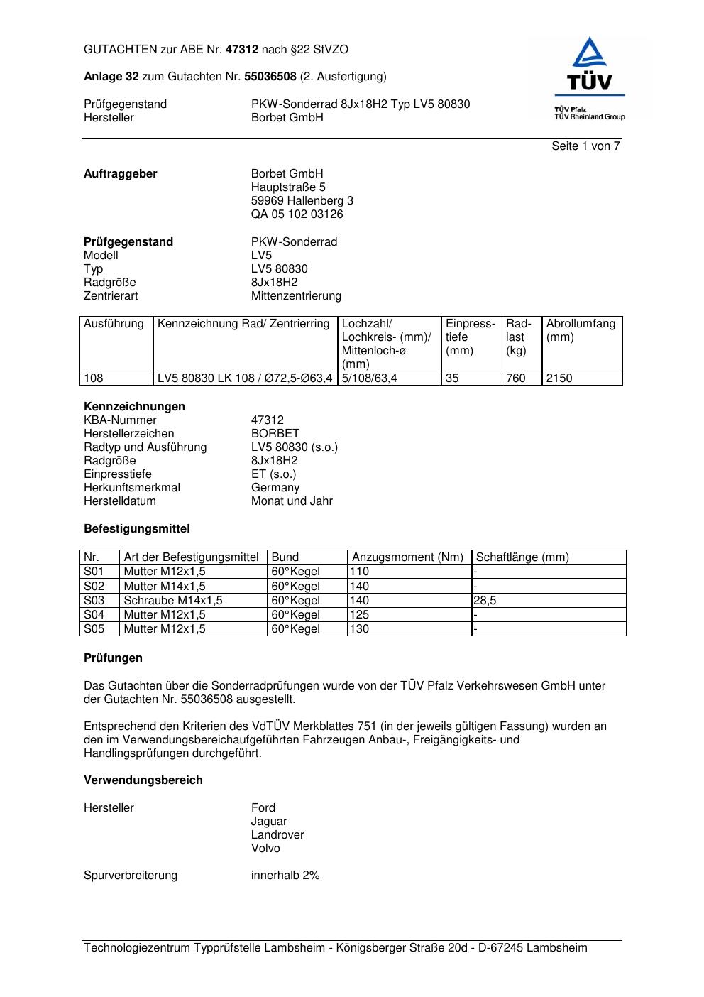 Dieses Gutachten (abe) bezieht sich auf die Alufelge Borbet LV5 80830 in der Ausführung 8Jx18 ET 0, Mittenloch 0 mm (KBA 47312). Im PDF findest du typischerweise zulässige Reifengrößen, Auflagen/Anbauhinweise und – je nach Dokument – Hinweise zur Eintragung.