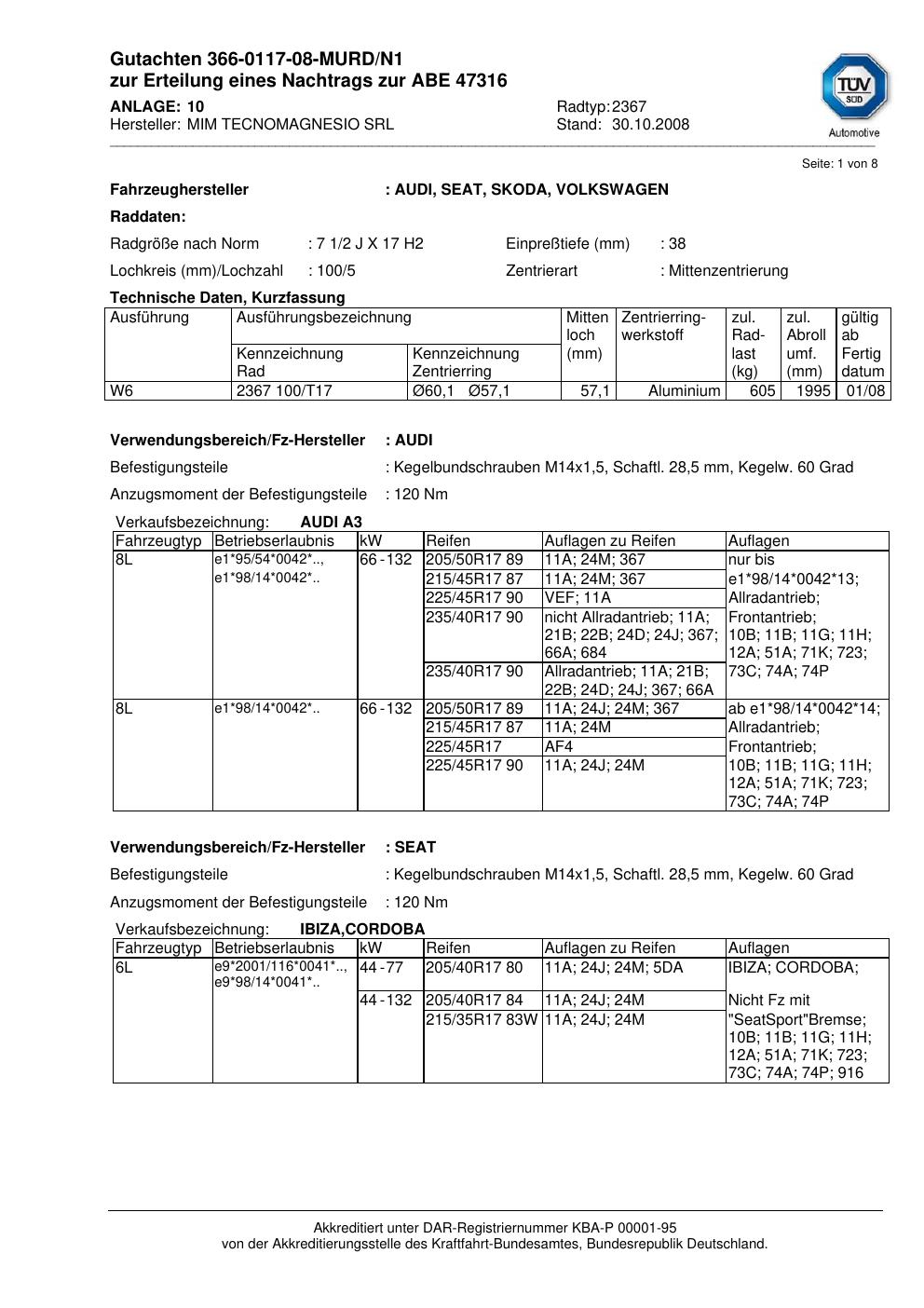 Felgengutachten / abe für Alufelgen ATS 2367 (2Jx17 ET 0, Mittenloch 0 mm) mit KBA 47316 (Zertifikatsnummer 47316). Hier kostenlos als PDF herunterladen. Der Download-Link ist 24 Stunden gültig und kann bis zu zwei Mal verwendet werden.