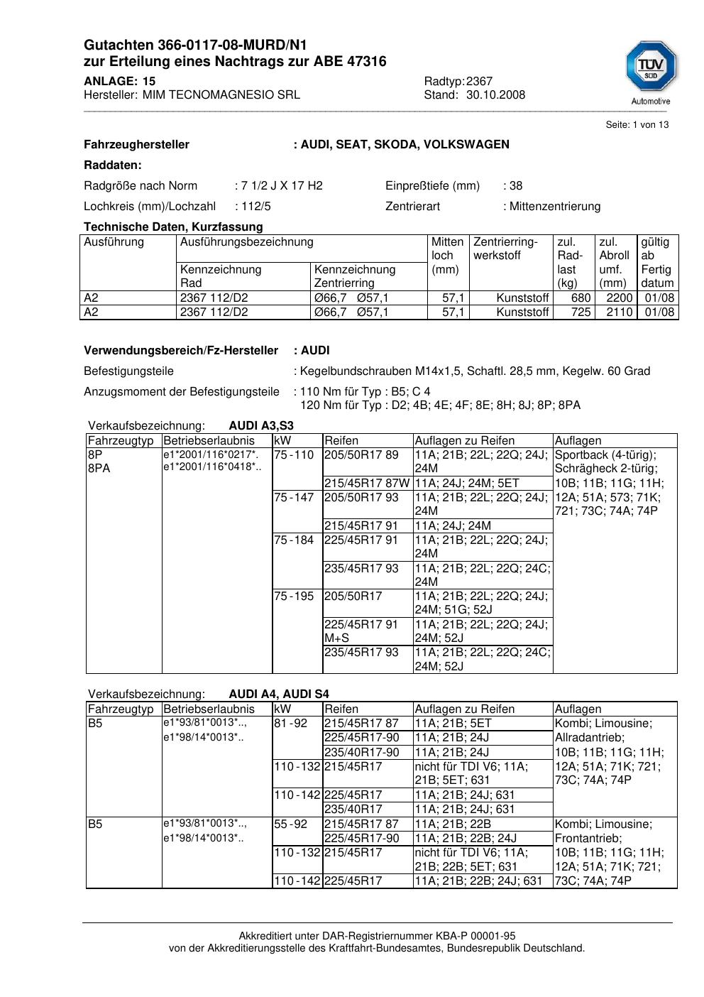 Dieses Gutachten (abe) bezieht sich auf die Alufelge ATS 2367 in der Ausführung 2Jx17 ET 0, Mittenloch 0 mm (KBA 47316). Im PDF findest du typischerweise zulässige Reifengrößen, Auflagen/Anbauhinweise und – je nach Dokument – Hinweise zur Eintragung.