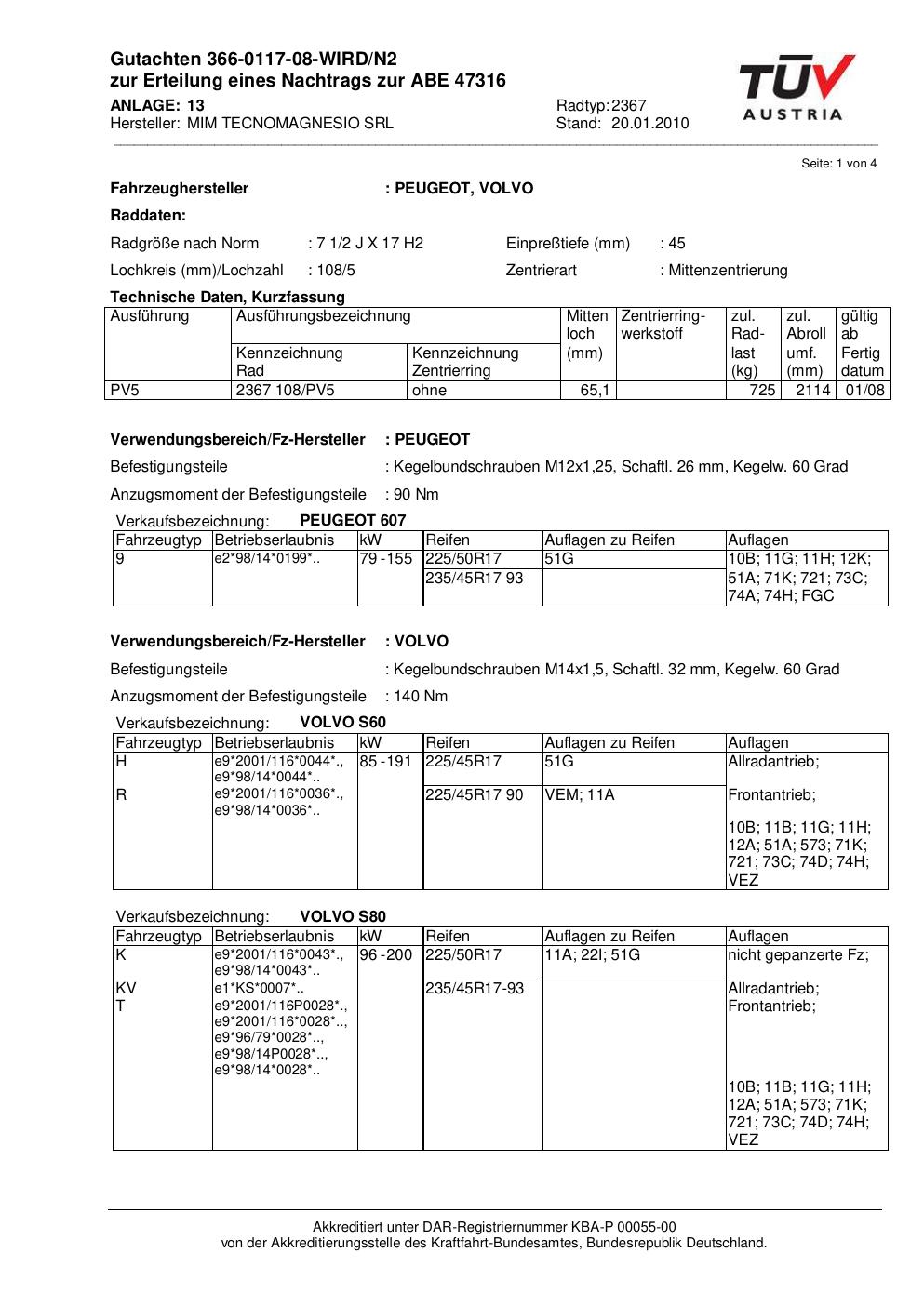 Dieses Gutachten (abe) bezieht sich auf die Alufelge ATS 2367 in der Ausführung 2Jx17 ET 0, Mittenloch 0 mm (KBA 47316). Im PDF findest du typischerweise zulässige Reifengrößen, Auflagen/Anbauhinweise und – je nach Dokument – Hinweise zur Eintragung.