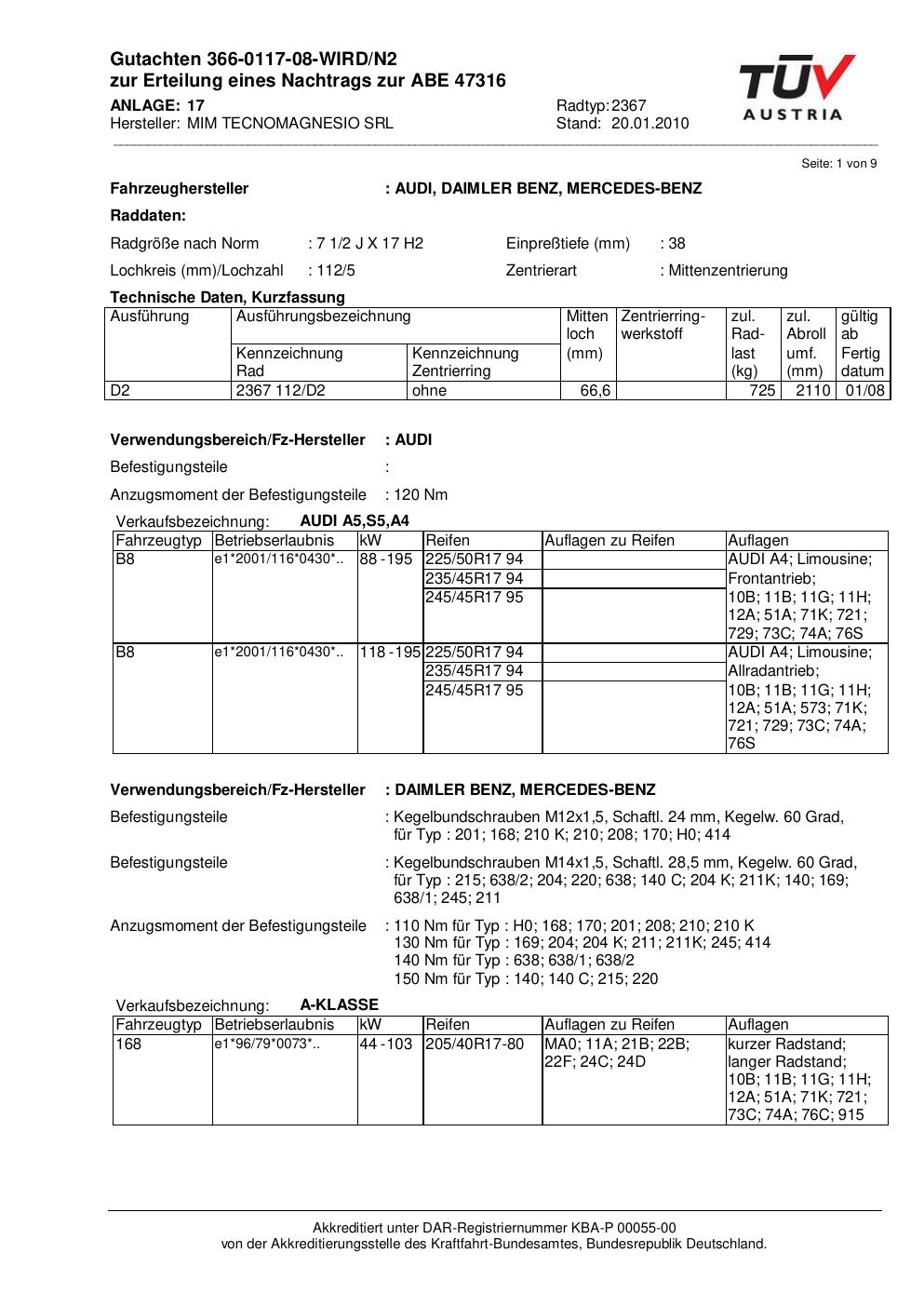 Dieses Gutachten (abe) bezieht sich auf die Alufelge ATS 2367 in der Ausführung 2Jx17 ET 0, Mittenloch 0 mm (KBA 47316). Im PDF findest du typischerweise zulässige Reifengrößen, Auflagen/Anbauhinweise und – je nach Dokument – Hinweise zur Eintragung.