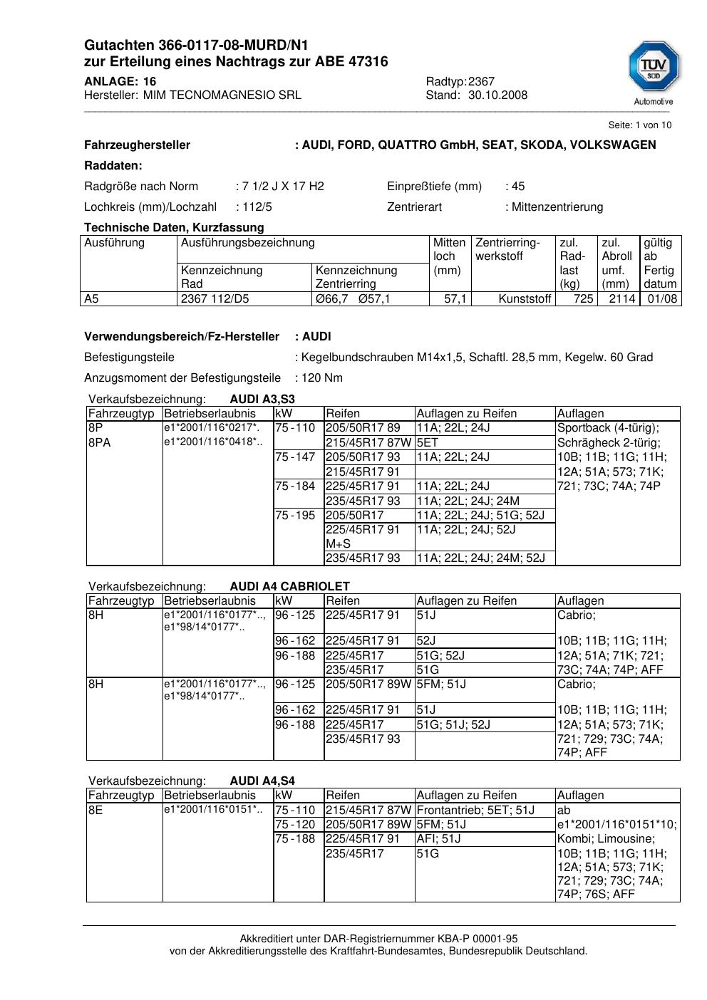 Dieses Gutachten (abe) bezieht sich auf die Alufelge ATS 2367 in der Ausführung 2Jx17 ET 0, Mittenloch 0 mm (KBA 47316). Im PDF findest du typischerweise zulässige Reifengrößen, Auflagen/Anbauhinweise und – je nach Dokument – Hinweise zur Eintragung.