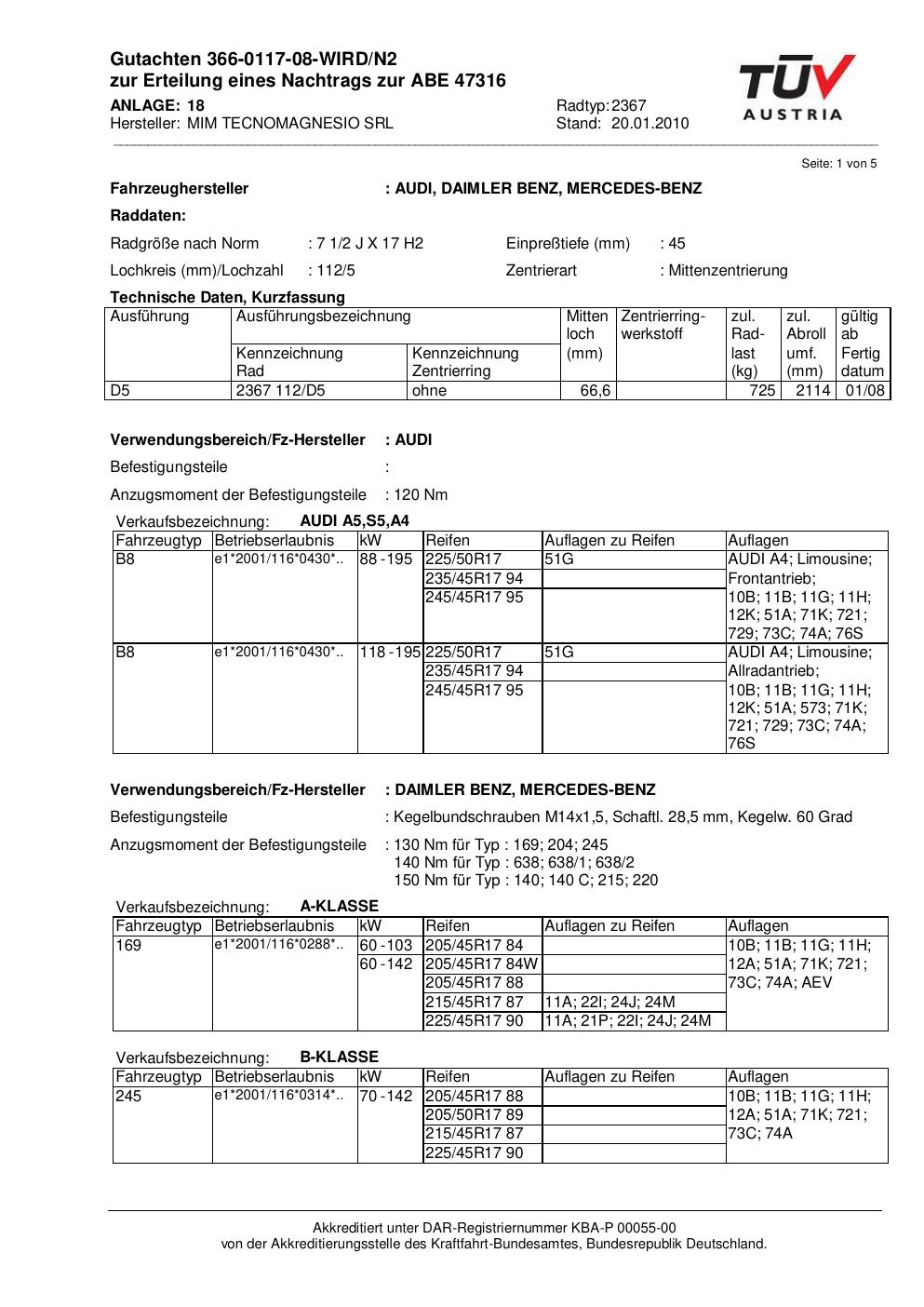Dieses Gutachten (abe) bezieht sich auf die Alufelge ATS 2367 in der Ausführung 2Jx17 ET 0, Mittenloch 0 mm (KBA 47316). Im PDF findest du typischerweise zulässige Reifengrößen, Auflagen/Anbauhinweise und – je nach Dokument – Hinweise zur Eintragung.