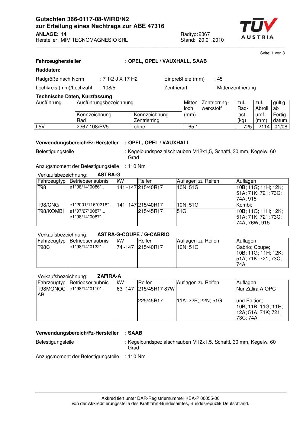 Felgengutachten / abe für Alufelgen ATS 2367 (2Jx17 ET 0, Mittenloch 0 mm) mit KBA 47316 (Zertifikatsnummer 47316). Hier kostenlos als PDF herunterladen. Der Download-Link ist 24 Stunden gültig und kann bis zu zwei Mal verwendet werden.