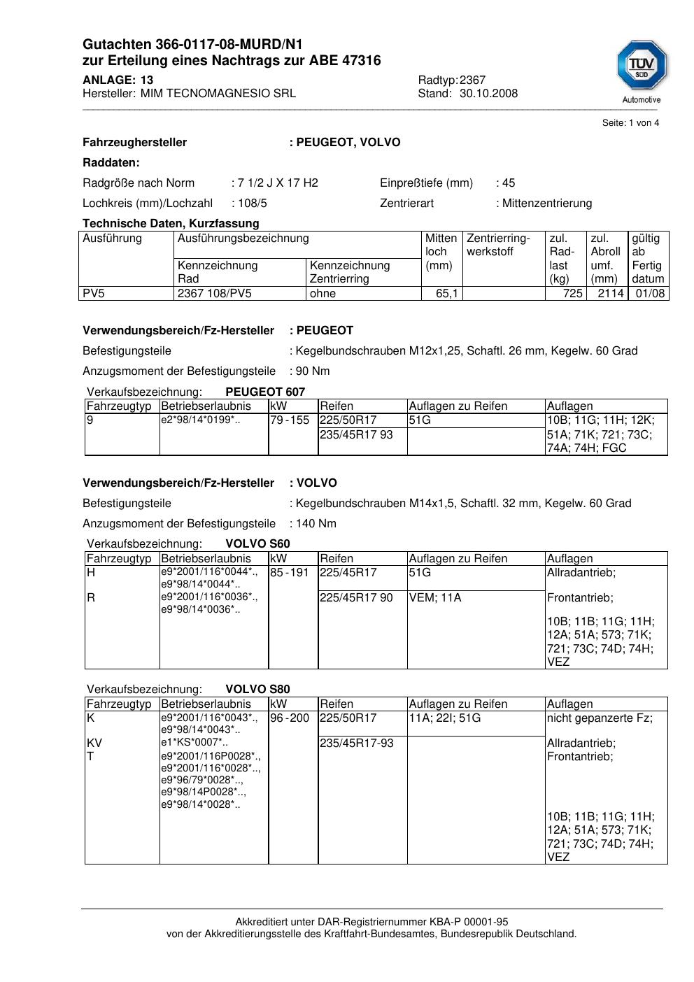Dieses Gutachten (abe) bezieht sich auf die Alufelge ATS 2367 in der Ausführung 2Jx17 ET 0, Mittenloch 0 mm (KBA 47316). Im PDF findest du typischerweise zulässige Reifengrößen, Auflagen/Anbauhinweise und – je nach Dokument – Hinweise zur Eintragung.