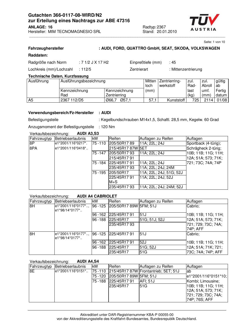 Felgengutachten / abe für Alufelgen ATS 2367 (2Jx17 ET 0, Mittenloch 0 mm) mit KBA 47316 (Zertifikatsnummer 47316). Hier kostenlos als PDF herunterladen. Der Download-Link ist 24 Stunden gültig und kann bis zu zwei Mal verwendet werden.
