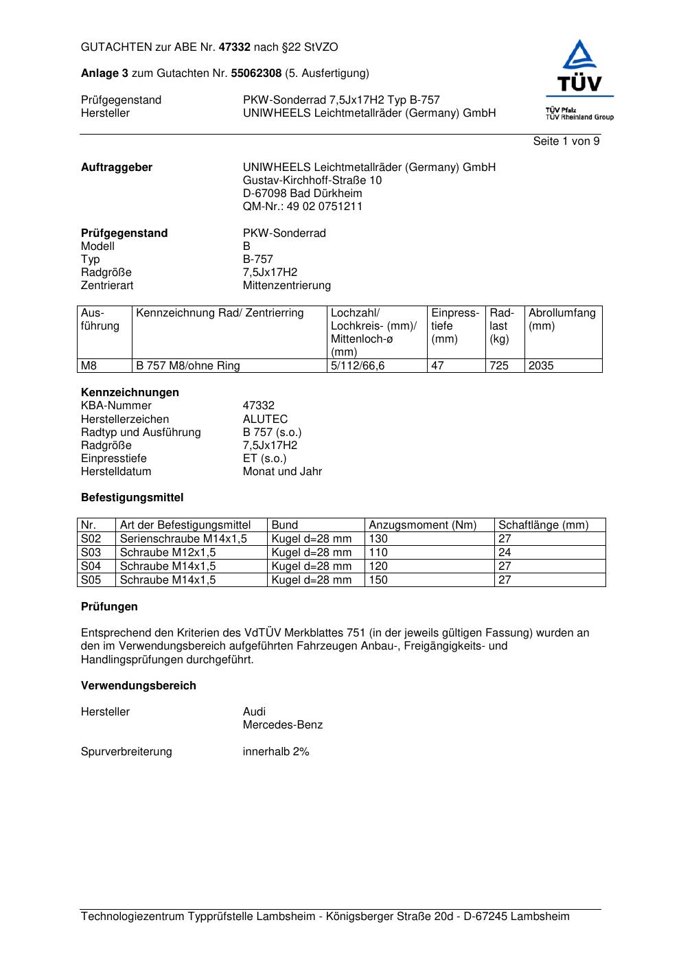 Dieses Gutachten (abe) bezieht sich auf die Alufelge ALUTEC B-757 in der Ausführung 7.5Jx17 ET 0, Mittenloch 0 mm (KBA 47332). Im PDF findest du typischerweise zulässige Reifengrößen, Auflagen/Anbauhinweise und – je nach Dokument – Hinweise zur Eintragung.