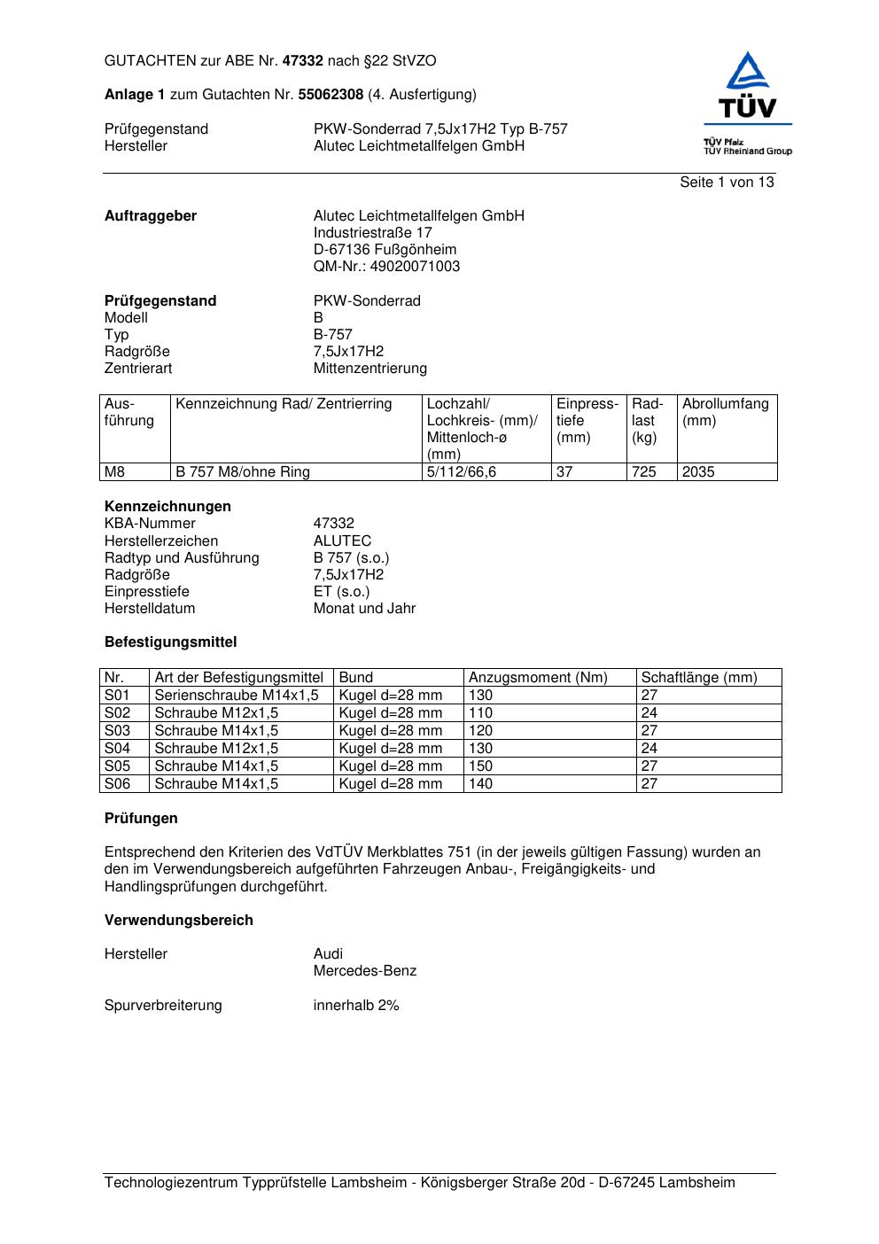 Dieses Gutachten (abe) bezieht sich auf die Alufelge ALUTEC B-757 in der Ausführung 7.5Jx17 ET 0, Mittenloch 0 mm (KBA 47332). Im PDF findest du typischerweise zulässige Reifengrößen, Auflagen/Anbauhinweise und – je nach Dokument – Hinweise zur Eintragung.
