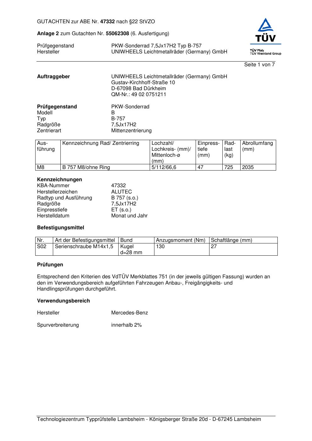Dieses Gutachten (abe) bezieht sich auf die Alufelge ALUTEC B-757 in der Ausführung 7.5Jx17 ET 0, Mittenloch 0 mm (KBA 47332). Im PDF findest du typischerweise zulässige Reifengrößen, Auflagen/Anbauhinweise und – je nach Dokument – Hinweise zur Eintragung.