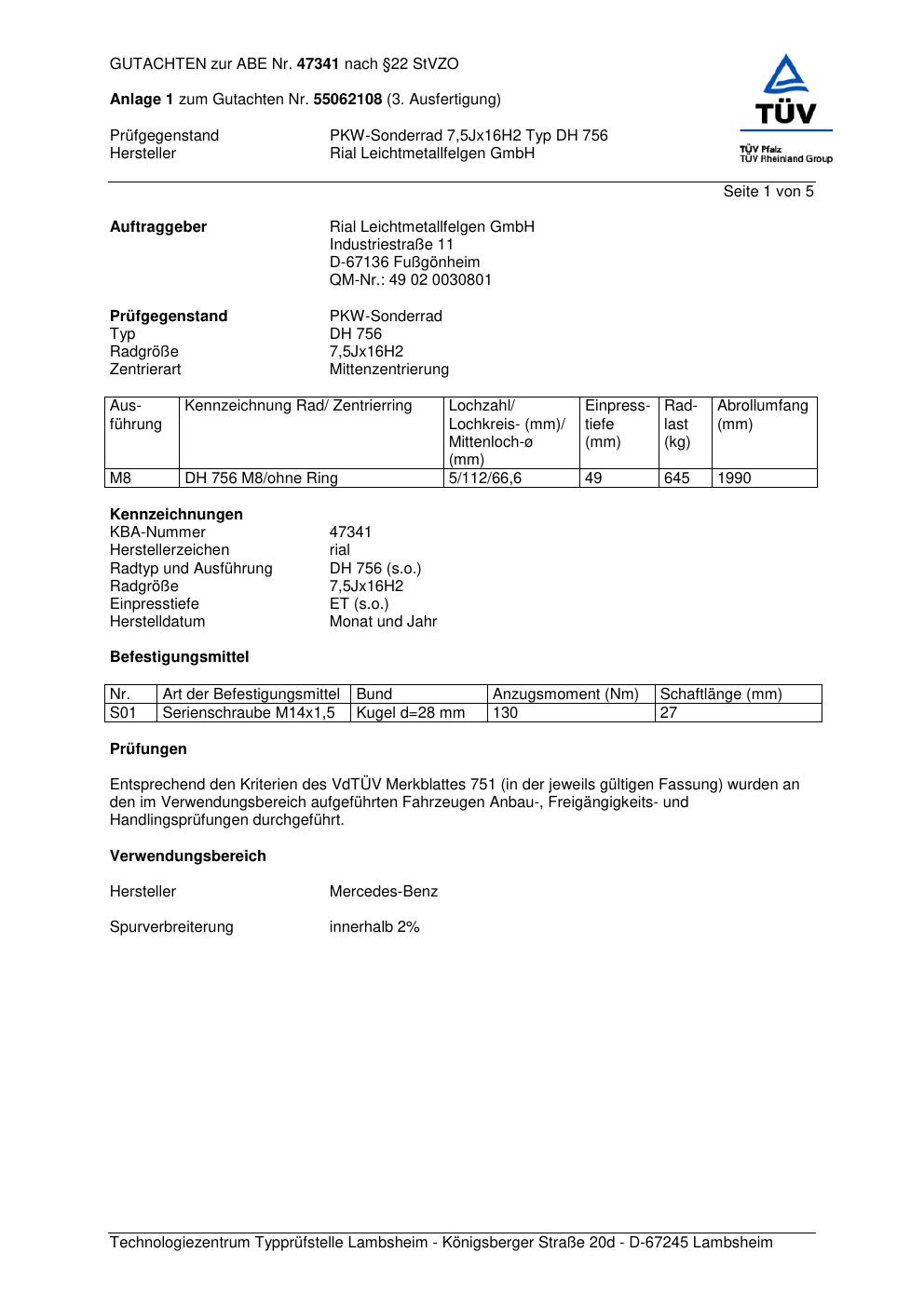 Dieses Gutachten (abe) bezieht sich auf die Alufelge brand-rial DH 756 in der Ausführung 7.5Jx16 ET 0, Mittenloch 0 mm (KBA 47341). Im PDF findest du typischerweise zulässige Reifengrößen, Auflagen/Anbauhinweise und – je nach Dokument – Hinweise zur Eintragung.