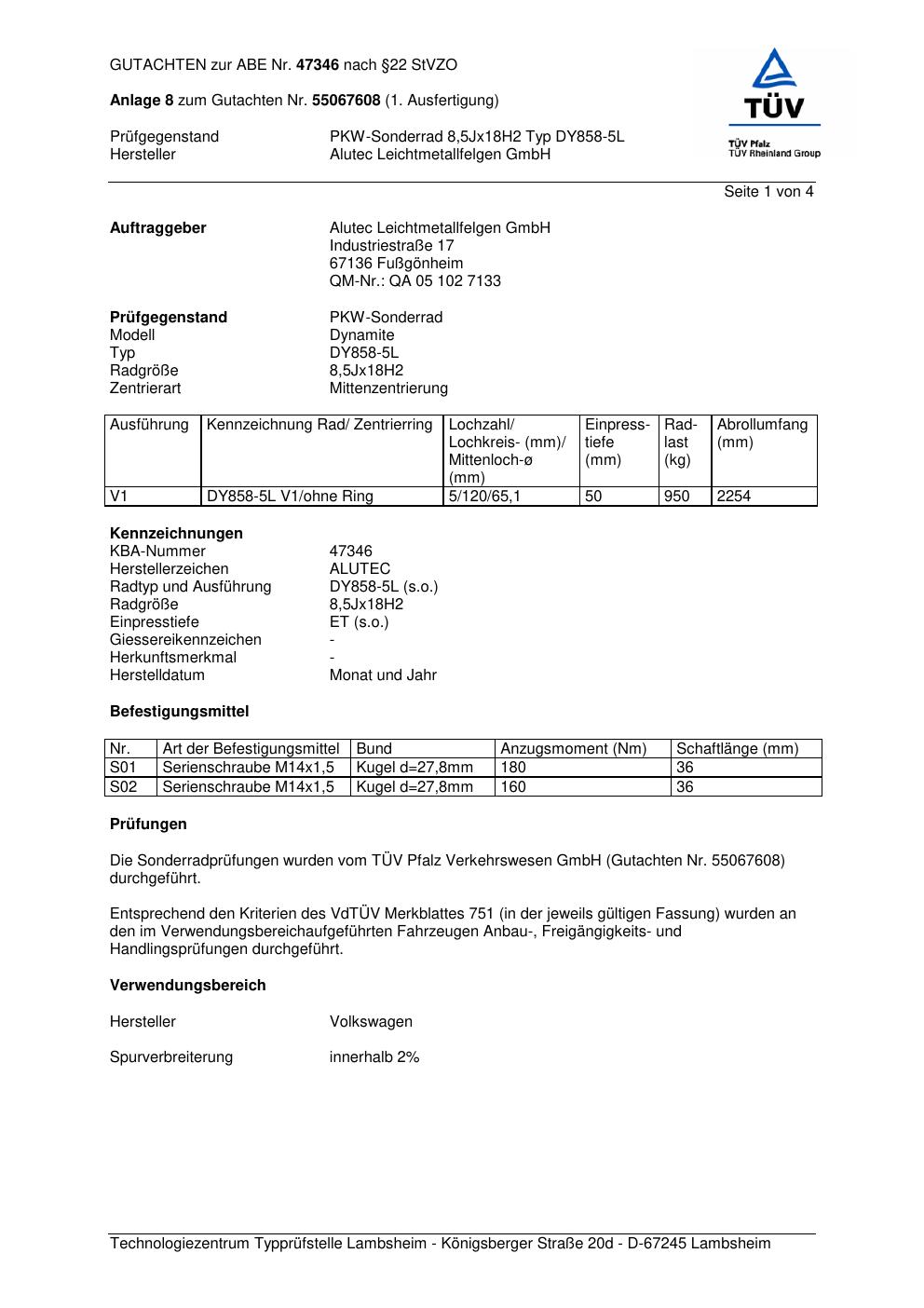 Dieses Gutachten (abe) bezieht sich auf die Alufelge ALUTEC DY858-5L in der Ausführung 8.5Jx18 ET 0, Mittenloch 0 mm (KBA 47346). Im PDF findest du typischerweise zulässige Reifengrößen, Auflagen/Anbauhinweise und – je nach Dokument – Hinweise zur Eintragung.