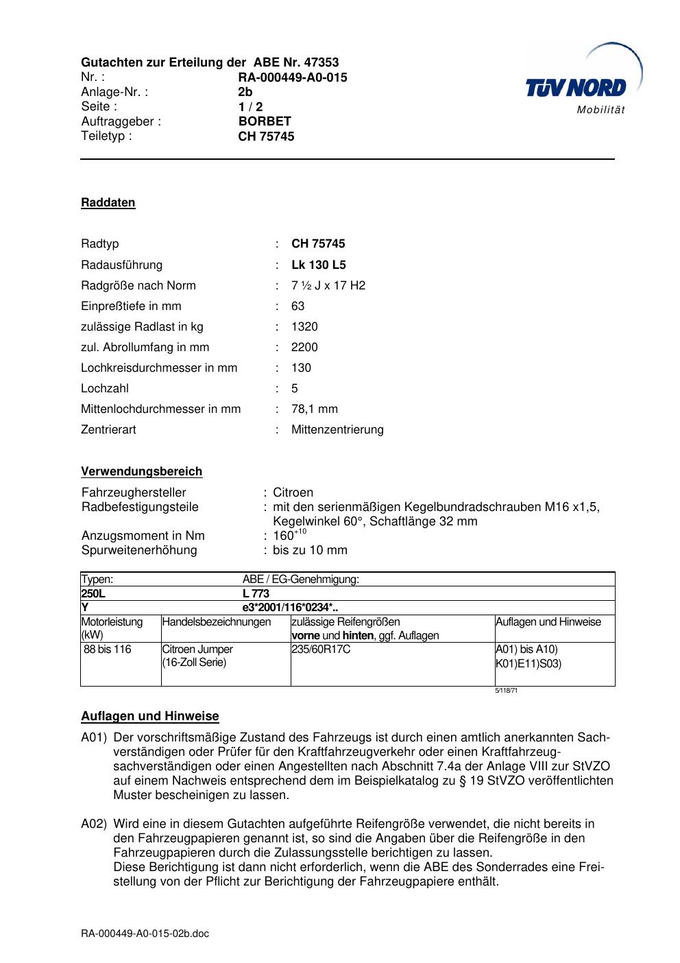Dieses Gutachten (abe) bezieht sich auf die Alufelge Borbet CH 75745 in der Ausführung ET 0, Mittenloch 0 mm (KBA 47353). Im PDF findest du typischerweise zulässige Reifengrößen, Auflagen/Anbauhinweise und – je nach Dokument – Hinweise zur Eintragung.