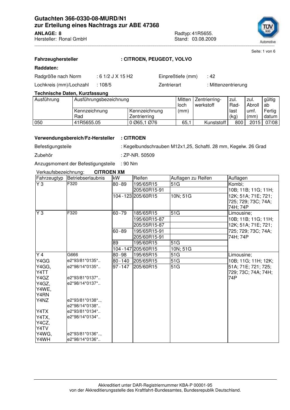 Dieses Gutachten (abe) bezieht sich auf die Alufelge Ronal 41R5655 in der Ausführung 2Jx15 ET 0, Mittenloch 0 mm (KBA 47368). Im PDF findest du typischerweise zulässige Reifengrößen, Auflagen/Anbauhinweise und – je nach Dokument – Hinweise zur Eintragung.