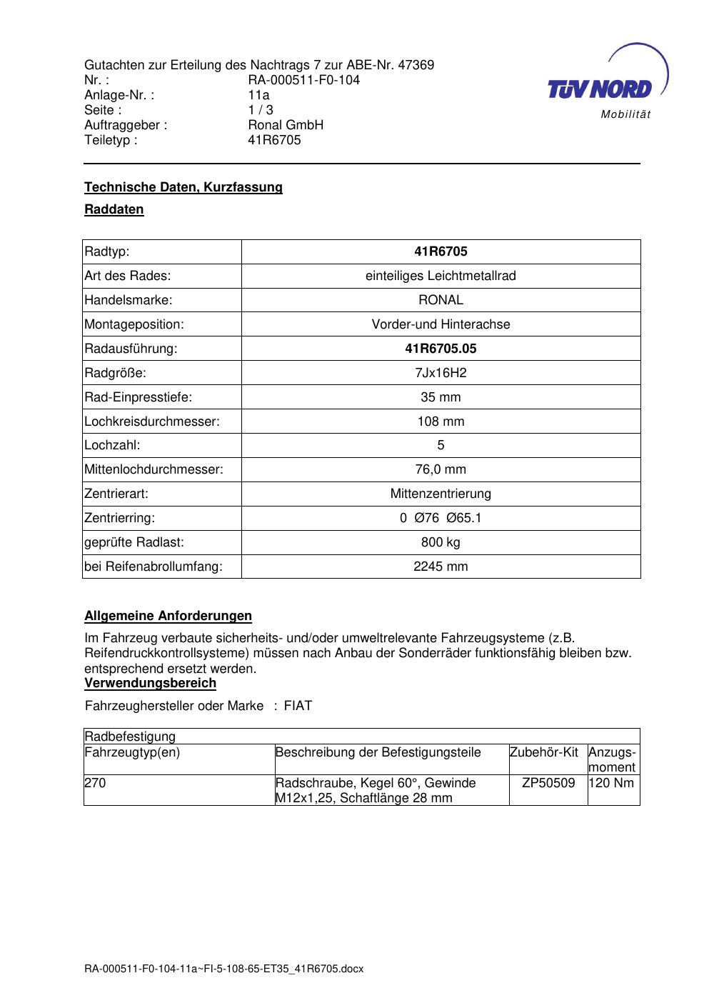 Dieses Gutachten (abe) bezieht sich auf die Alufelge brand-ronal 41R6705 in der Ausführung 7Jx16 ET 0, Mittenloch 0 mm (KBA 47369). Im PDF findest du typischerweise zulässige Reifengrößen, Auflagen/Anbauhinweise und – je nach Dokument – Hinweise zur Eintragung.