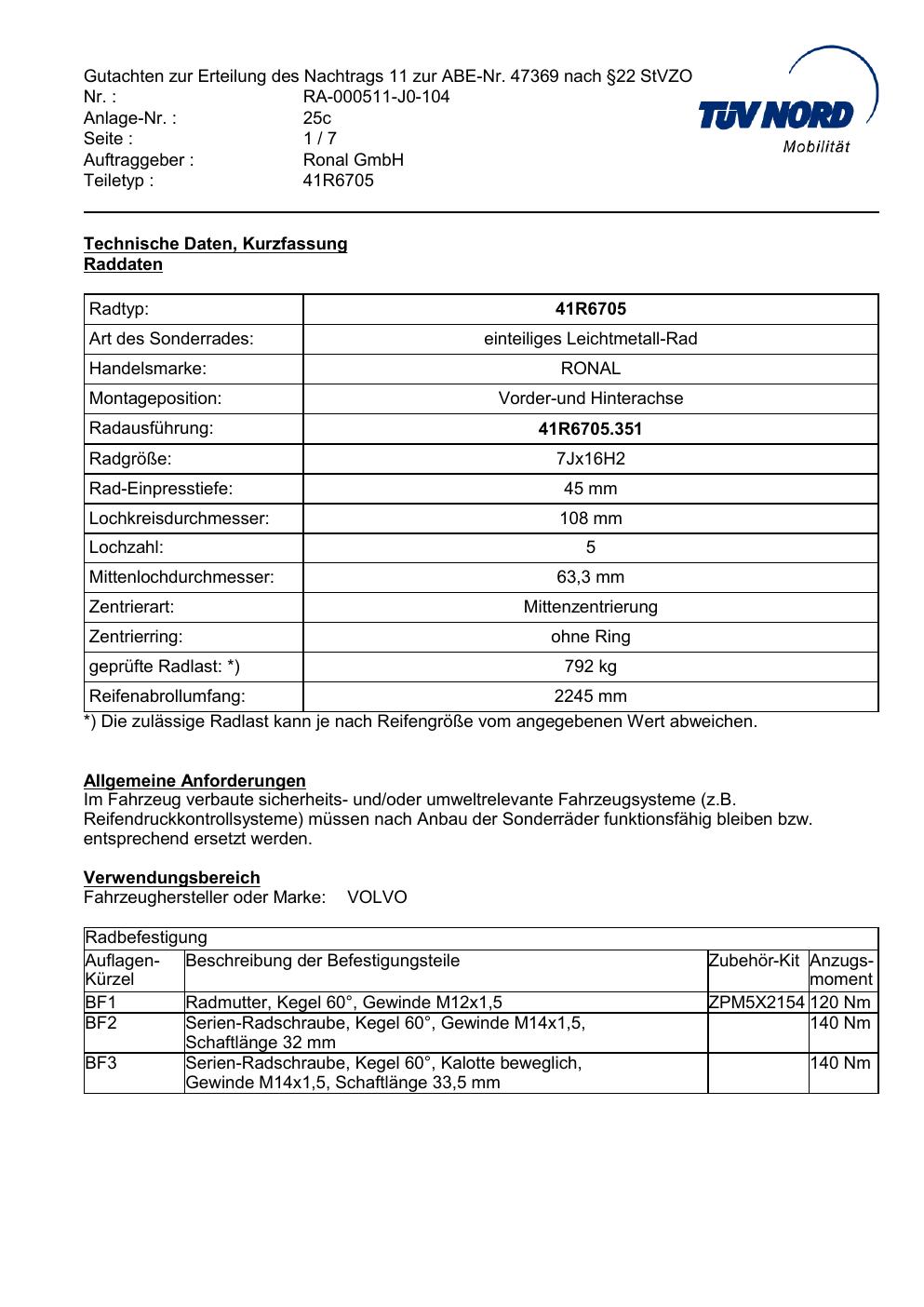 Dieses Gutachten (abe) bezieht sich auf die Alufelge brand-ronal 41R6705 in der Ausführung 7Jx16 ET 0, Mittenloch 0 mm (KBA 47369). Im PDF findest du typischerweise zulässige Reifengrößen, Auflagen/Anbauhinweise und – je nach Dokument – Hinweise zur Eintragung.