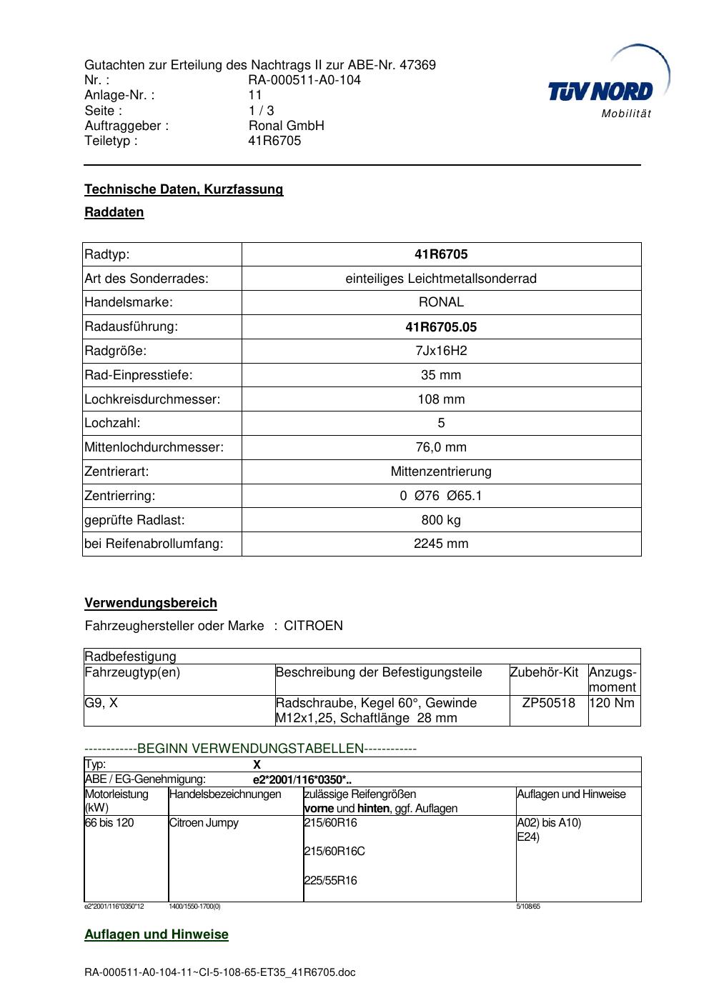 Dieses Gutachten (abe) bezieht sich auf die Alufelge brand-ronal 41R6705 in der Ausführung 7Jx16 ET 0, Mittenloch 0 mm (KBA 47369). Im PDF findest du typischerweise zulässige Reifengrößen, Auflagen/Anbauhinweise und – je nach Dokument – Hinweise zur Eintragung.
