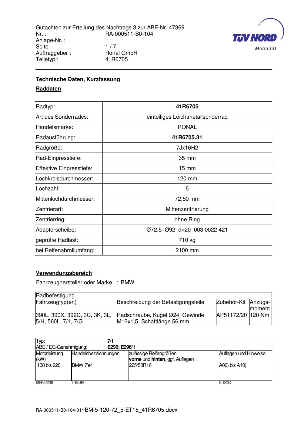 Dieses Gutachten (abe) bezieht sich auf die Alufelge brand-ronal 41R6705 in der Ausführung 7Jx16 ET 0, Mittenloch 0 mm (KBA 47369). Im PDF findest du typischerweise zulässige Reifengrößen, Auflagen/Anbauhinweise und – je nach Dokument – Hinweise zur Eintragung.