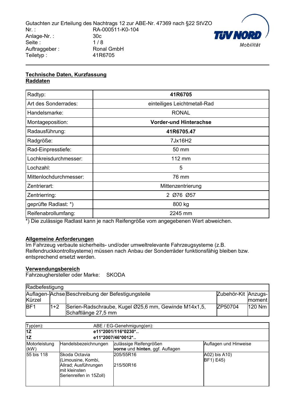Dieses Gutachten (abe) bezieht sich auf die Alufelge brand-ronal 41R6705 in der Ausführung 7Jx16 ET 0, Mittenloch 0 mm (KBA 47369). Im PDF findest du typischerweise zulässige Reifengrößen, Auflagen/Anbauhinweise und – je nach Dokument – Hinweise zur Eintragung.