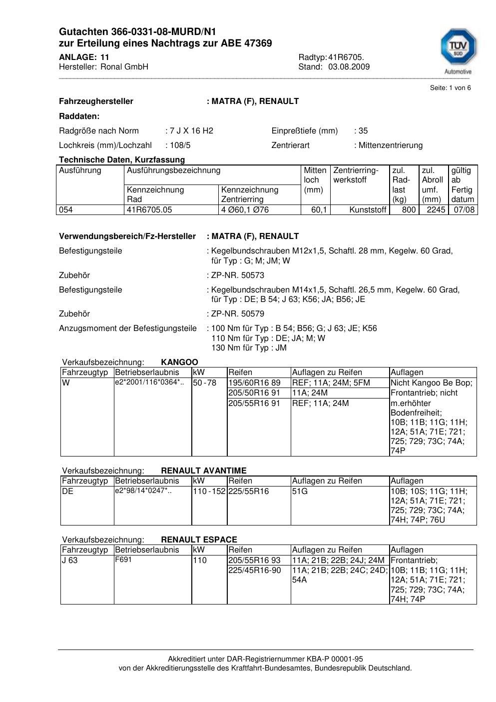 Dieses Gutachten (abe) bezieht sich auf die Alufelge Ronal 41R6705 in der Ausführung 7Jx16 ET 0, Mittenloch 0 mm (KBA 47369). Im PDF findest du typischerweise zulässige Reifengrößen, Auflagen/Anbauhinweise und – je nach Dokument – Hinweise zur Eintragung.