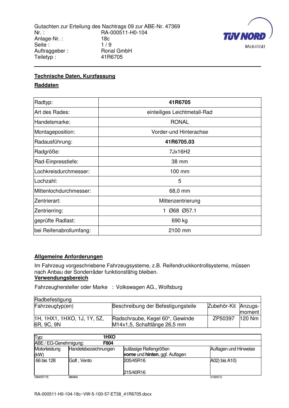 Dieses Gutachten (abe) bezieht sich auf die Alufelge brand-ronal 41R6705 in der Ausführung 7Jx16 ET 0, Mittenloch 0 mm (KBA 47369). Im PDF findest du typischerweise zulässige Reifengrößen, Auflagen/Anbauhinweise und – je nach Dokument – Hinweise zur Eintragung.