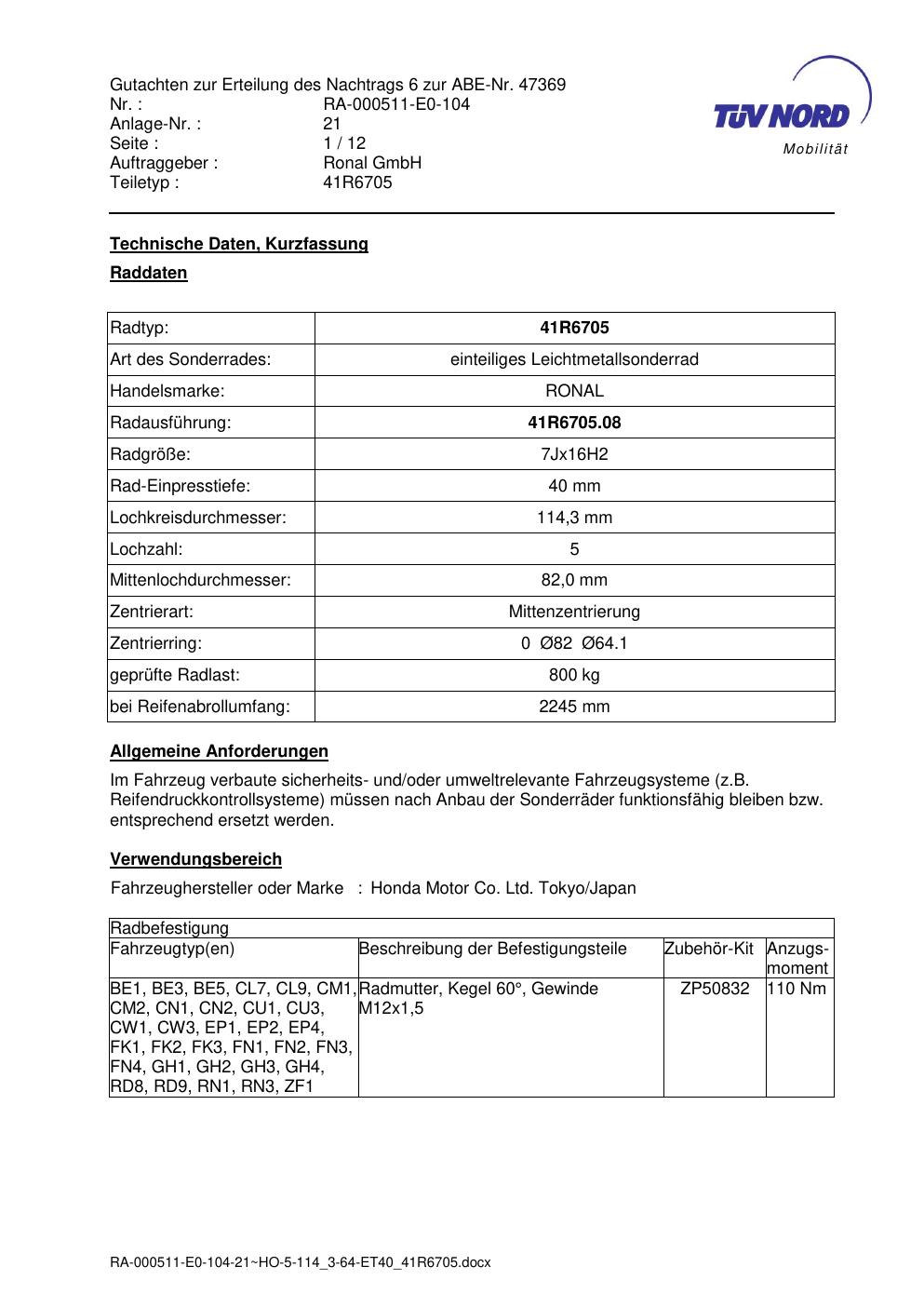 Dieses Gutachten (abe) bezieht sich auf die Alufelge brand-ronal 41R6705 in der Ausführung 7Jx16 ET 0, Mittenloch 0 mm (KBA 47369). Im PDF findest du typischerweise zulässige Reifengrößen, Auflagen/Anbauhinweise und – je nach Dokument – Hinweise zur Eintragung.