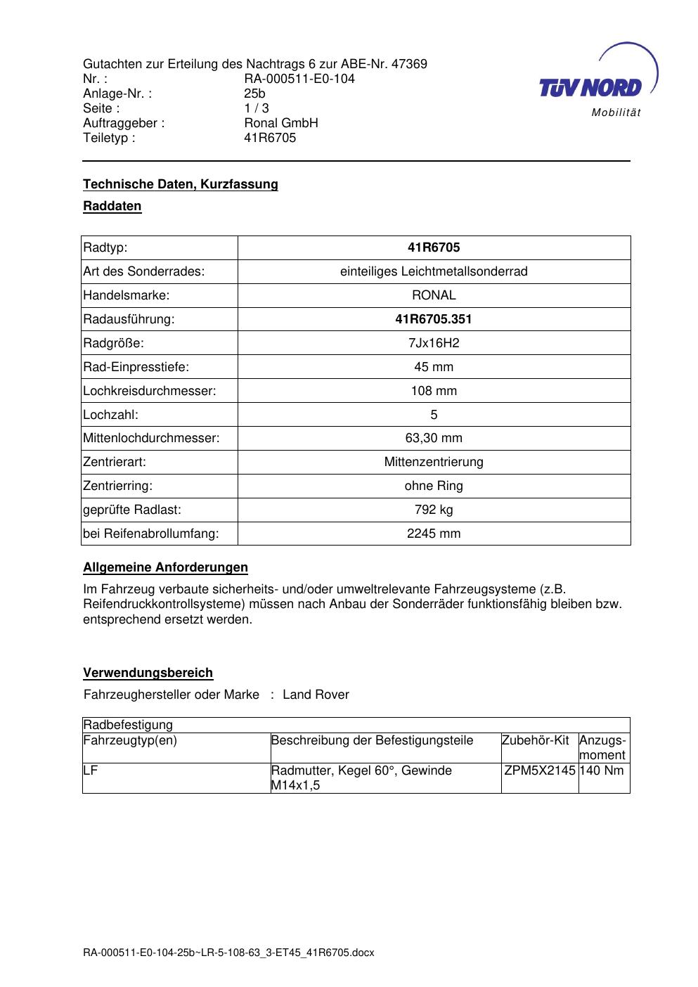 Dieses Gutachten (abe) bezieht sich auf die Alufelge brand-ronal 41R6705 in der Ausführung 7Jx16 ET 0, Mittenloch 0 mm (KBA 47369). Im PDF findest du typischerweise zulässige Reifengrößen, Auflagen/Anbauhinweise und – je nach Dokument – Hinweise zur Eintragung.