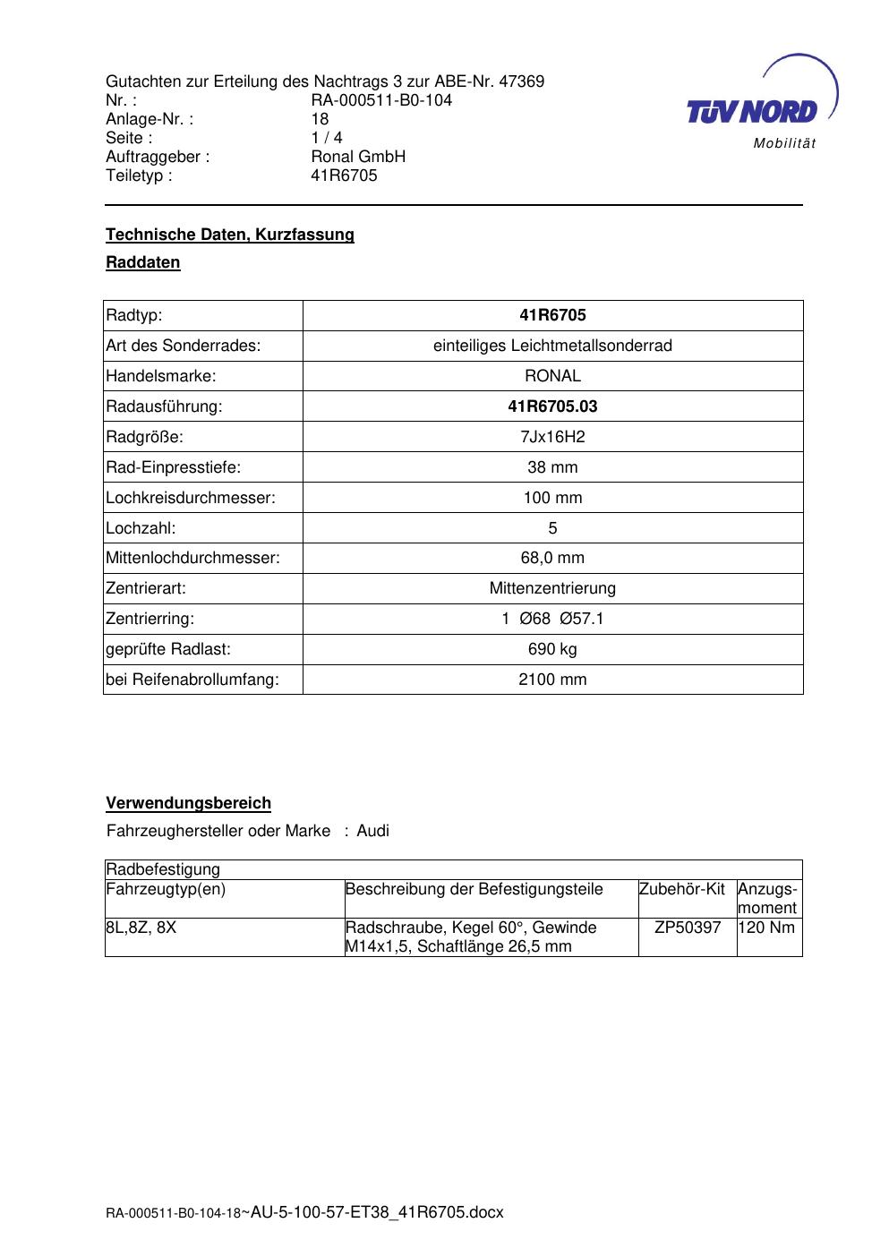 Dieses Gutachten (abe) bezieht sich auf die Alufelge brand-ronal 41R6705 in der Ausführung 7Jx16 ET 0, Mittenloch 0 mm (KBA 47369). Im PDF findest du typischerweise zulässige Reifengrößen, Auflagen/Anbauhinweise und – je nach Dokument – Hinweise zur Eintragung.