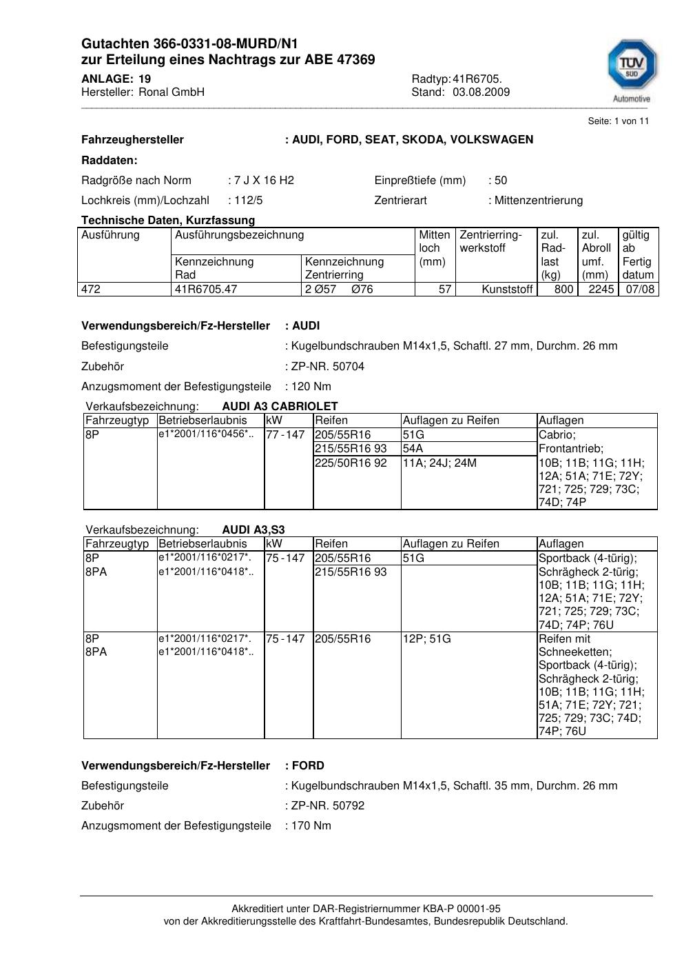 Dieses Gutachten (abe) bezieht sich auf die Alufelge Ronal 41R6705 in der Ausführung 7Jx16 ET 0, Mittenloch 0 mm (KBA 47369). Im PDF findest du typischerweise zulässige Reifengrößen, Auflagen/Anbauhinweise und – je nach Dokument – Hinweise zur Eintragung.