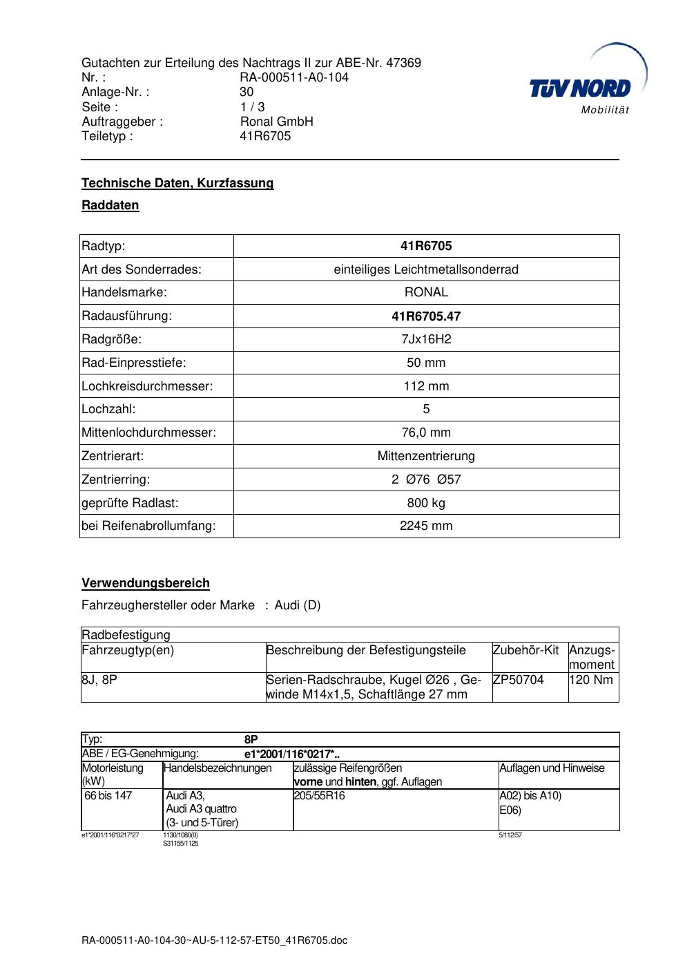 Dieses Gutachten (abe) bezieht sich auf die Alufelge brand-ronal 41R6705 in der Ausführung 7Jx16 ET 0, Mittenloch 0 mm (KBA 47369). Im PDF findest du typischerweise zulässige Reifengrößen, Auflagen/Anbauhinweise und – je nach Dokument – Hinweise zur Eintragung.