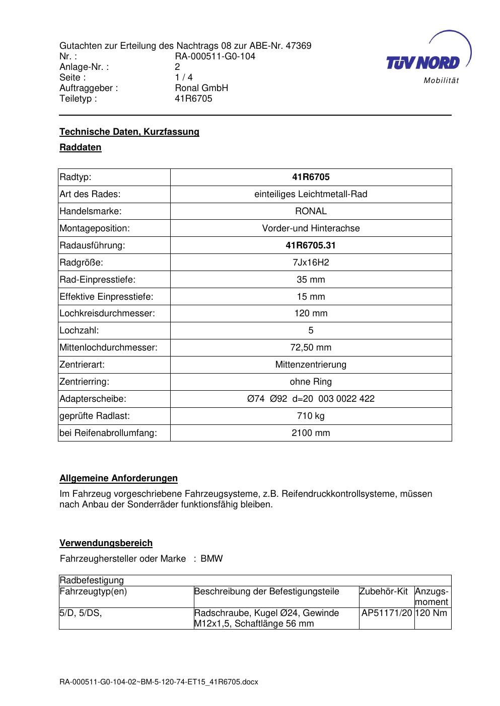 Dieses Gutachten (abe) bezieht sich auf die Alufelge brand-ronal 41R6705 in der Ausführung 7Jx16 ET 0, Mittenloch 0 mm (KBA 47369). Im PDF findest du typischerweise zulässige Reifengrößen, Auflagen/Anbauhinweise und – je nach Dokument – Hinweise zur Eintragung.