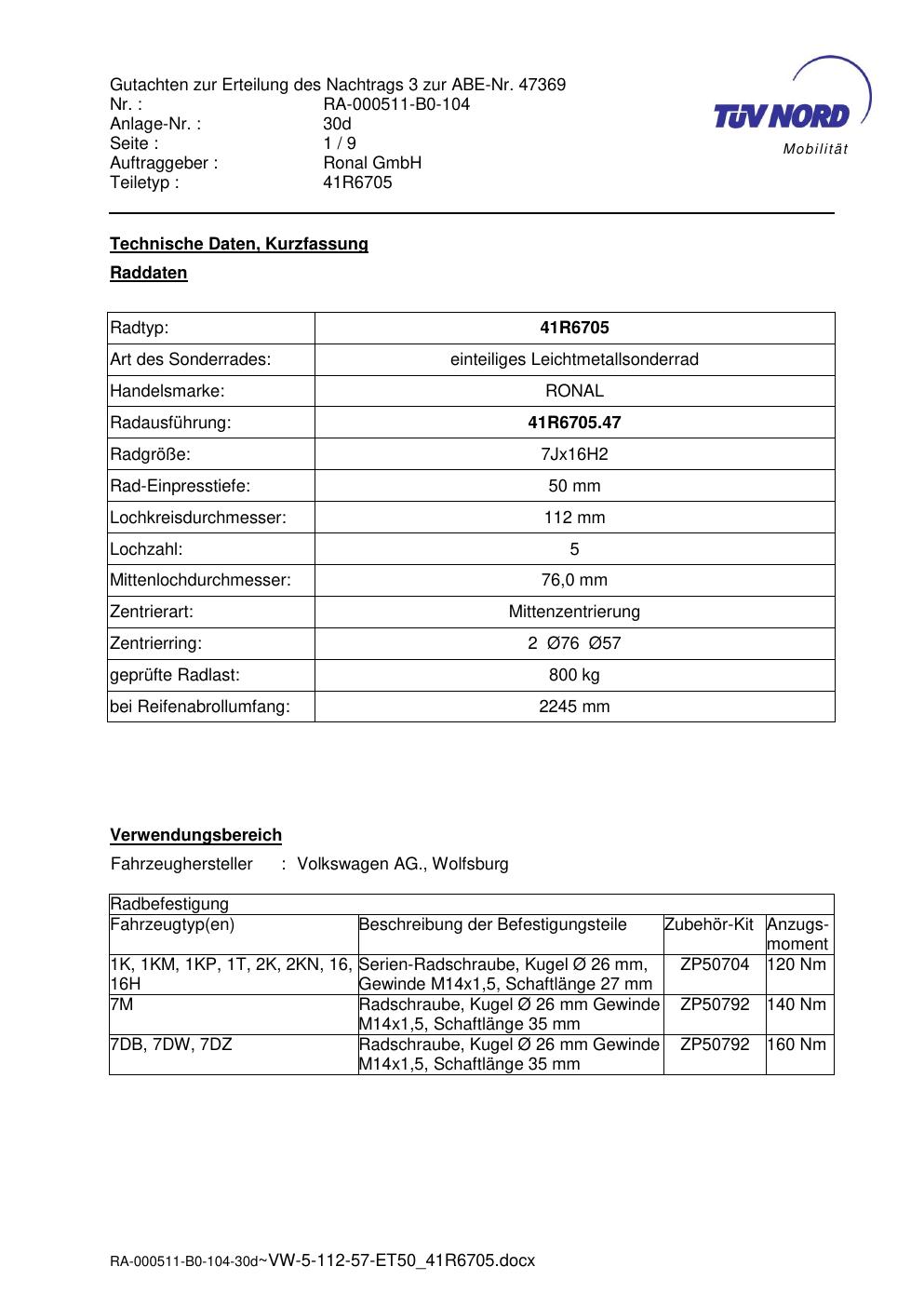 Dieses Gutachten (abe) bezieht sich auf die Alufelge brand-ronal 41R6705 in der Ausführung 7Jx16 ET 0, Mittenloch 0 mm (KBA 47369). Im PDF findest du typischerweise zulässige Reifengrößen, Auflagen/Anbauhinweise und – je nach Dokument – Hinweise zur Eintragung.