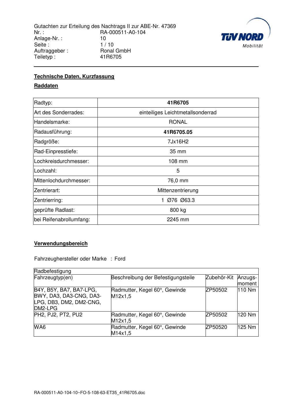 Dieses Gutachten (abe) bezieht sich auf die Alufelge brand-ronal 41R6705 in der Ausführung 7Jx16 ET 0, Mittenloch 0 mm (KBA 47369). Im PDF findest du typischerweise zulässige Reifengrößen, Auflagen/Anbauhinweise und – je nach Dokument – Hinweise zur Eintragung.