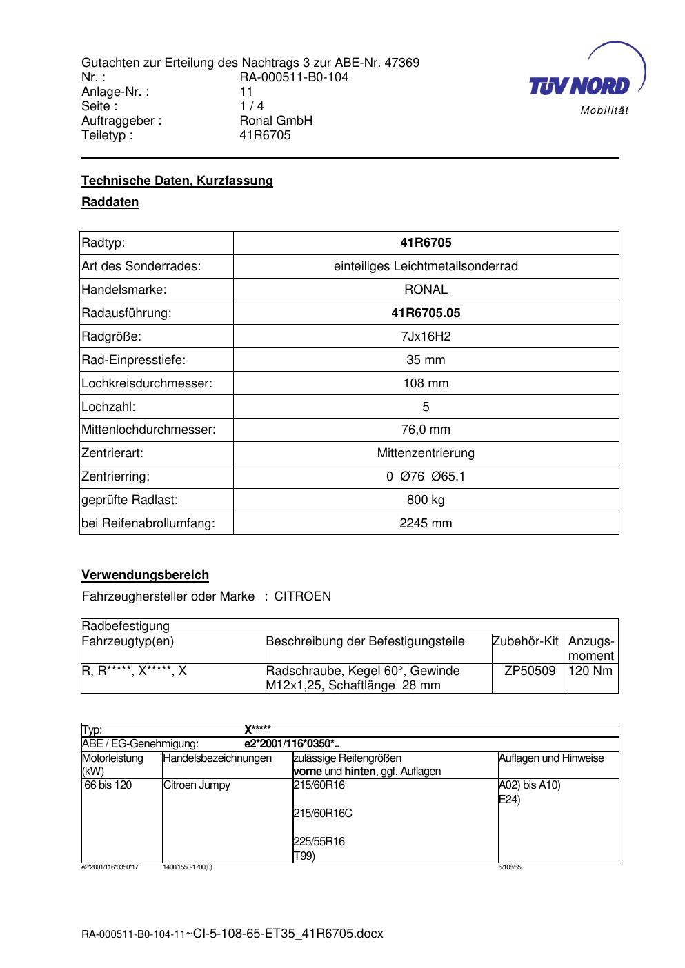 Dieses Gutachten (abe) bezieht sich auf die Alufelge brand-ronal 41R6705 in der Ausführung 7Jx16 ET 0, Mittenloch 0 mm (KBA 47369). Im PDF findest du typischerweise zulässige Reifengrößen, Auflagen/Anbauhinweise und – je nach Dokument – Hinweise zur Eintragung.