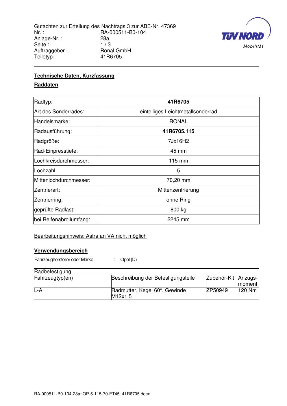 Dieses Gutachten (abe) bezieht sich auf die Alufelge brand-ronal 41R6705 in der Ausführung 7Jx16 ET 0, Mittenloch 0 mm (KBA 47369). Im PDF findest du typischerweise zulässige Reifengrößen, Auflagen/Anbauhinweise und – je nach Dokument – Hinweise zur Eintragung.