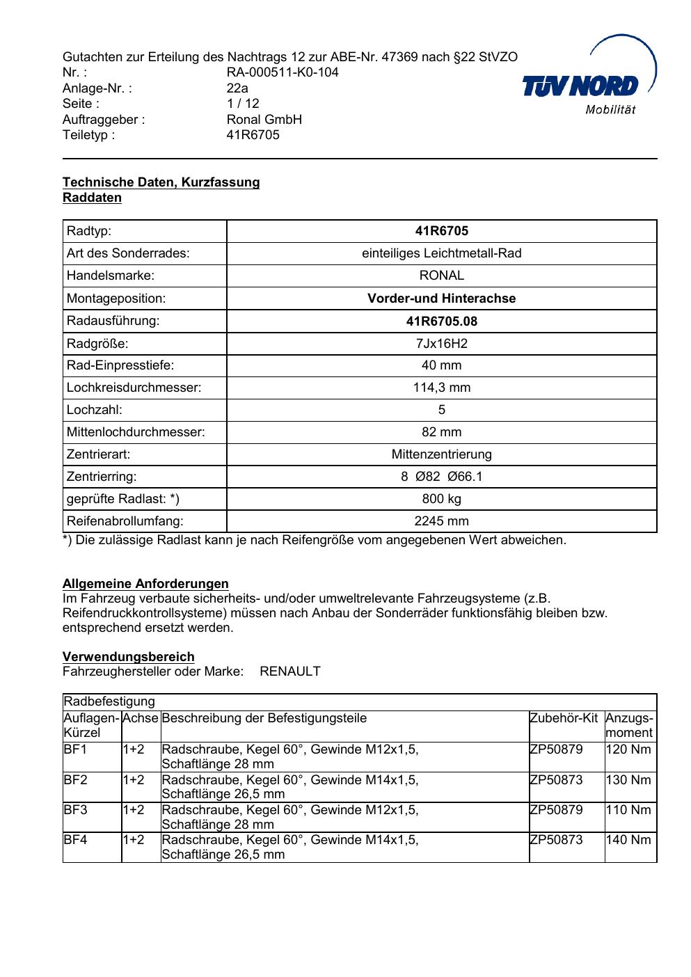 Dieses Gutachten (abe) bezieht sich auf die Alufelge brand-ronal 41R6705 in der Ausführung 7Jx16 ET 0, Mittenloch 0 mm (KBA 47369). Im PDF findest du typischerweise zulässige Reifengrößen, Auflagen/Anbauhinweise und – je nach Dokument – Hinweise zur Eintragung.