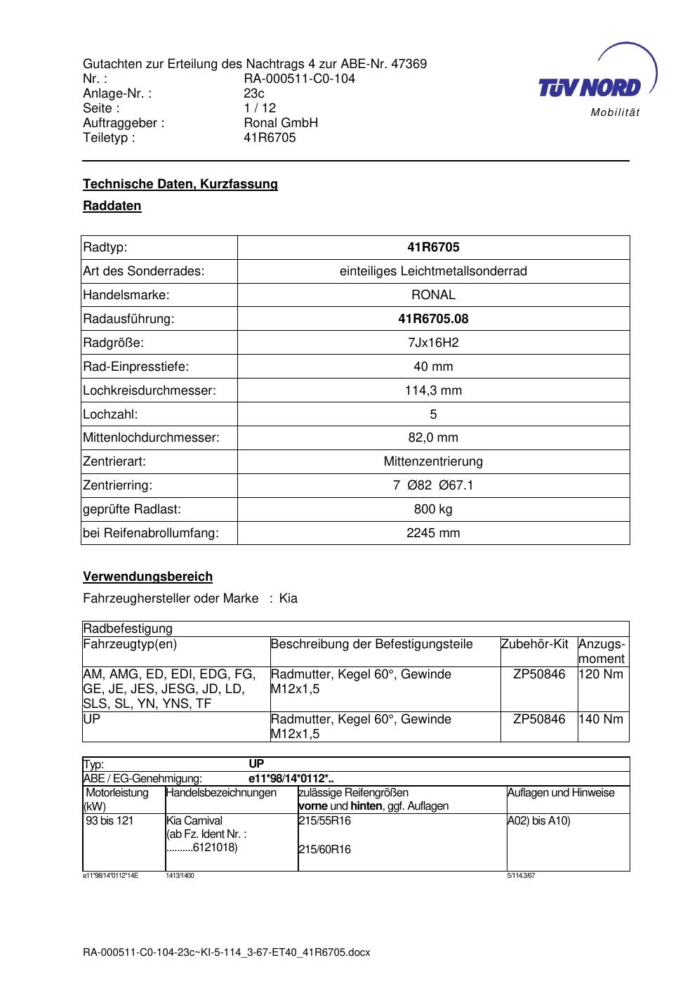 Dieses Gutachten (abe) bezieht sich auf die Alufelge brand-ronal 41R6705 in der Ausführung 7Jx16 ET 0, Mittenloch 0 mm (KBA 47369). Im PDF findest du typischerweise zulässige Reifengrößen, Auflagen/Anbauhinweise und – je nach Dokument – Hinweise zur Eintragung.