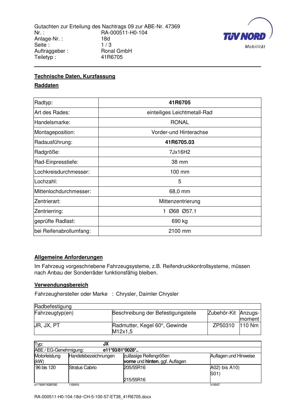 Dieses Gutachten (abe) bezieht sich auf die Alufelge brand-ronal 41R6705 in der Ausführung 7Jx16 ET 0, Mittenloch 0 mm (KBA 47369). Im PDF findest du typischerweise zulässige Reifengrößen, Auflagen/Anbauhinweise und – je nach Dokument – Hinweise zur Eintragung.