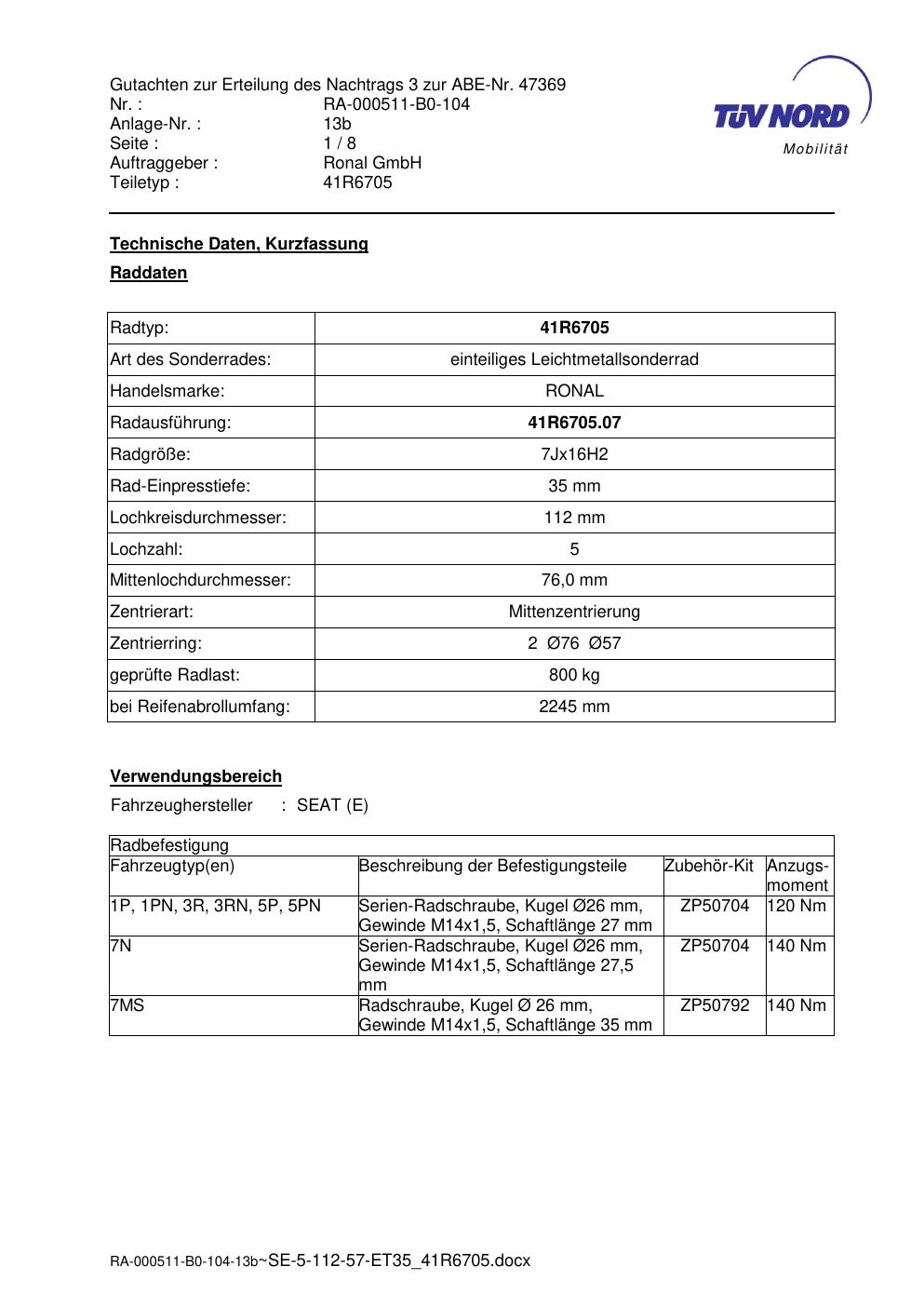 Dieses Gutachten (abe) bezieht sich auf die Alufelge brand-ronal 41R6705 in der Ausführung 7Jx16 ET 0, Mittenloch 0 mm (KBA 47369). Im PDF findest du typischerweise zulässige Reifengrößen, Auflagen/Anbauhinweise und – je nach Dokument – Hinweise zur Eintragung.