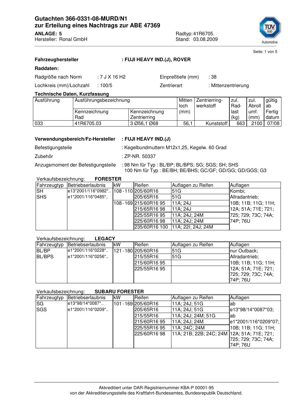 Dieses Gutachten (abe) bezieht sich auf die Alufelge Ronal 41R6705 in der Ausführung 7Jx16 ET 0, Mittenloch 0 mm (KBA 47369). Im PDF findest du typischerweise zulässige Reifengrößen, Auflagen/Anbauhinweise und – je nach Dokument – Hinweise zur Eintragung.