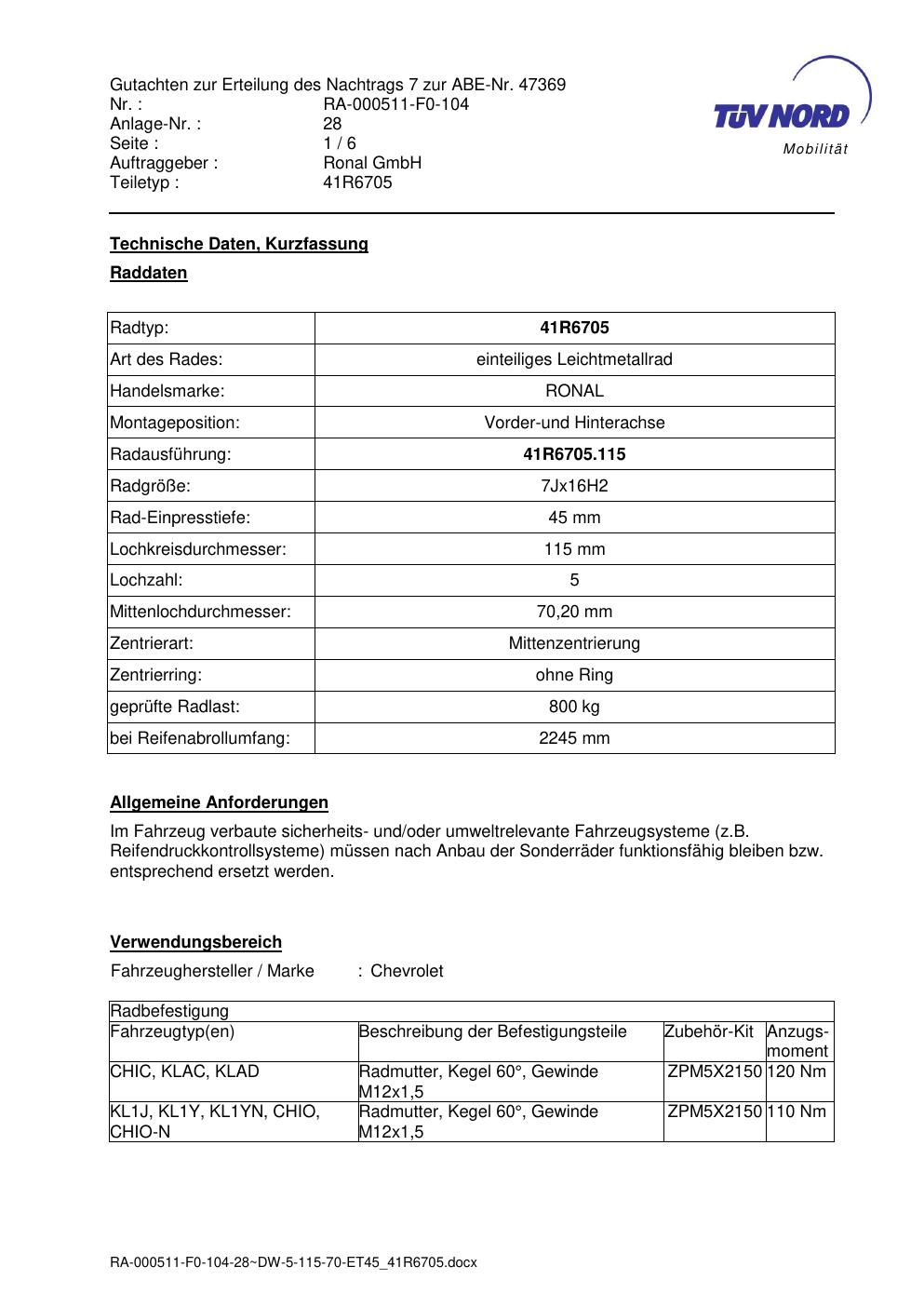 Dieses Gutachten (abe) bezieht sich auf die Alufelge brand-ronal 41R6705 in der Ausführung 7Jx16 ET 0, Mittenloch 0 mm (KBA 47369). Im PDF findest du typischerweise zulässige Reifengrößen, Auflagen/Anbauhinweise und – je nach Dokument – Hinweise zur Eintragung.