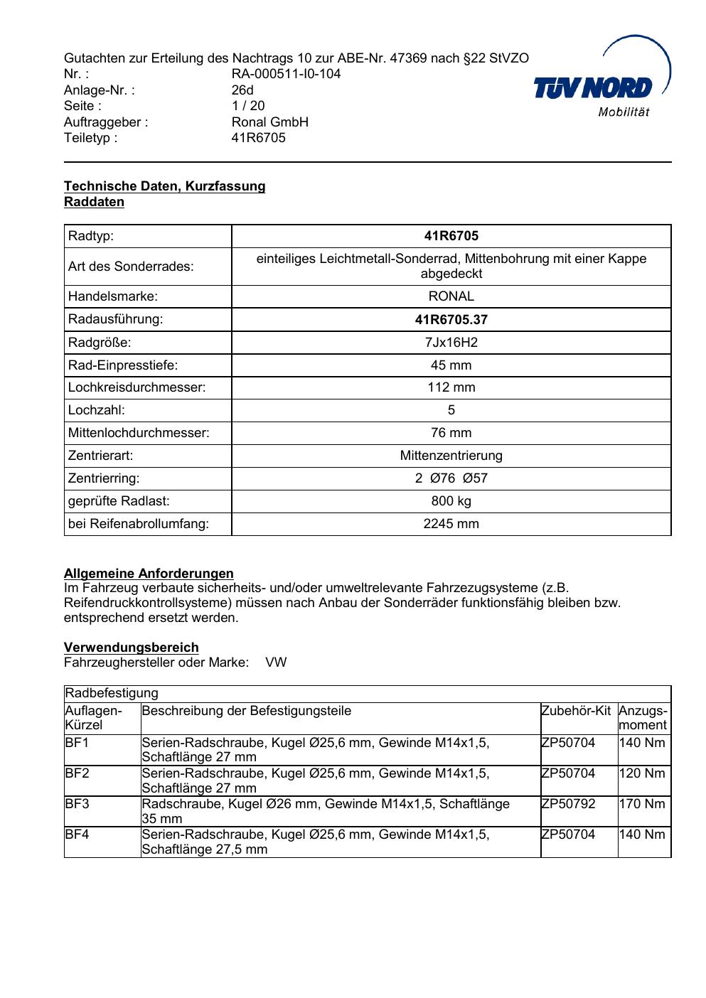 Dieses Gutachten (abe) bezieht sich auf die Alufelge brand-ronal 41R6705 in der Ausführung 7Jx16 ET 0, Mittenloch 0 mm (KBA 47369). Im PDF findest du typischerweise zulässige Reifengrößen, Auflagen/Anbauhinweise und – je nach Dokument – Hinweise zur Eintragung.
