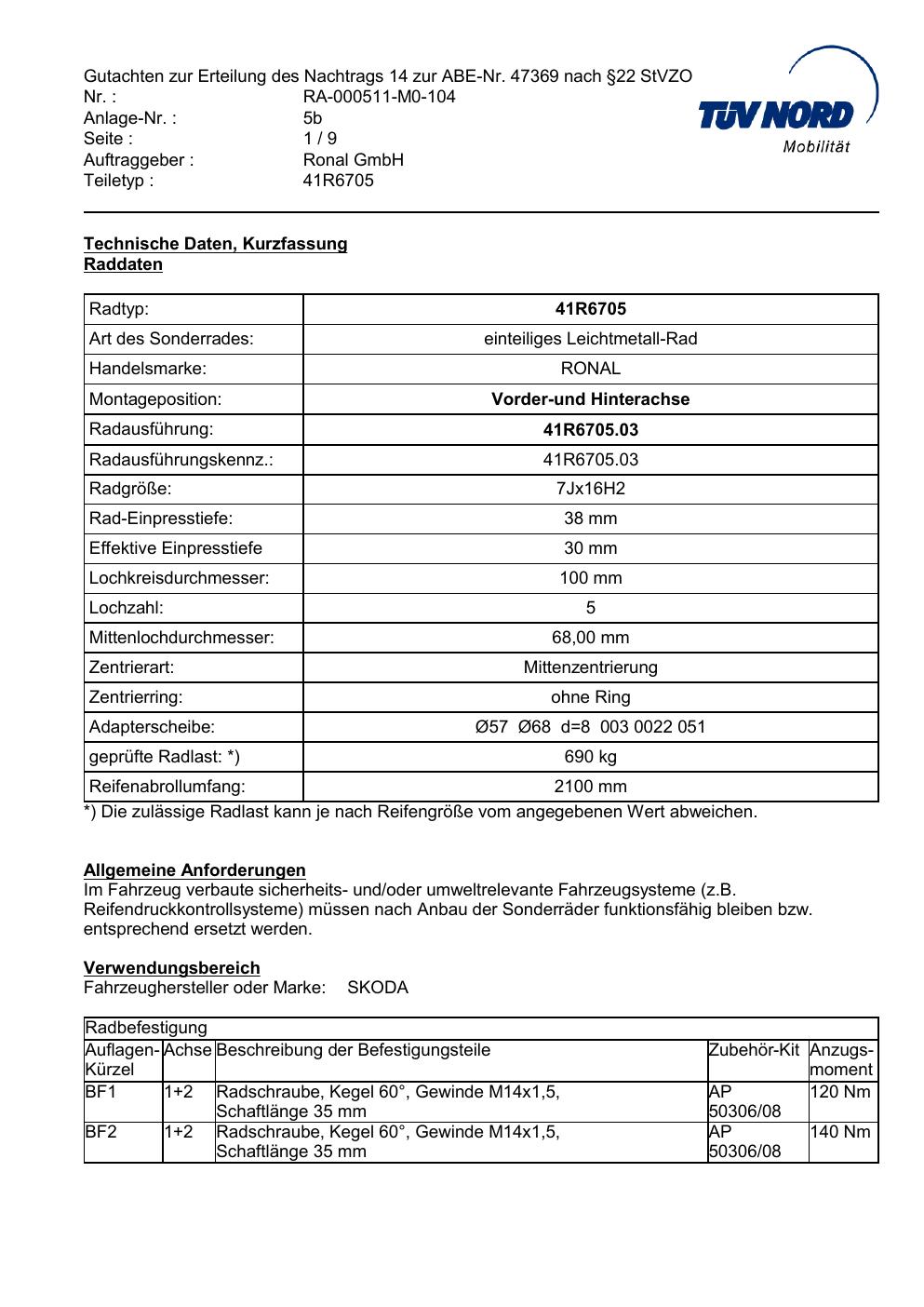 Dieses Gutachten (abe) bezieht sich auf die Alufelge brand-ronal 41R6705 in der Ausführung 7Jx16 ET 0, Mittenloch 0 mm (KBA 47369). Im PDF findest du typischerweise zulässige Reifengrößen, Auflagen/Anbauhinweise und – je nach Dokument – Hinweise zur Eintragung.