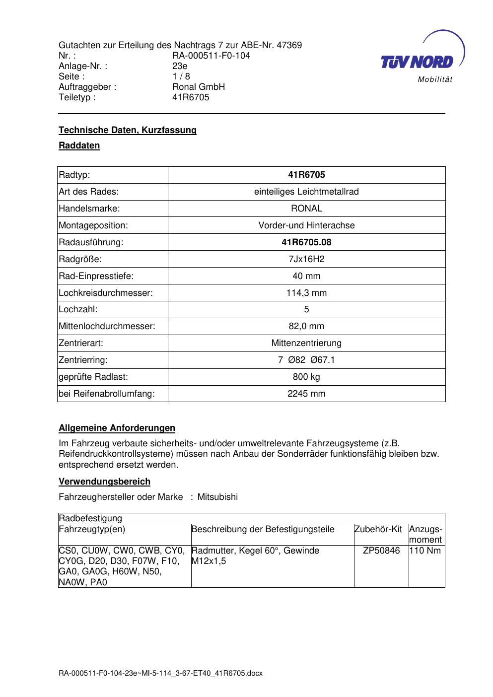Dieses Gutachten (abe) bezieht sich auf die Alufelge brand-ronal 41R6705 in der Ausführung 7Jx16 ET 0, Mittenloch 0 mm (KBA 47369). Im PDF findest du typischerweise zulässige Reifengrößen, Auflagen/Anbauhinweise und – je nach Dokument – Hinweise zur Eintragung.