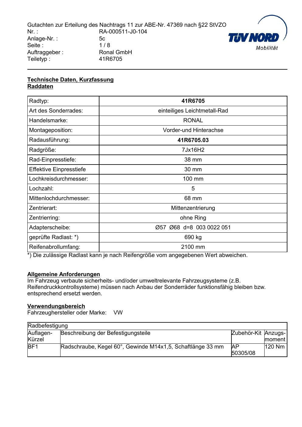 Dieses Gutachten (abe) bezieht sich auf die Alufelge brand-ronal 41R6705 in der Ausführung 7Jx16 ET 0, Mittenloch 0 mm (KBA 47369). Im PDF findest du typischerweise zulässige Reifengrößen, Auflagen/Anbauhinweise und – je nach Dokument – Hinweise zur Eintragung.