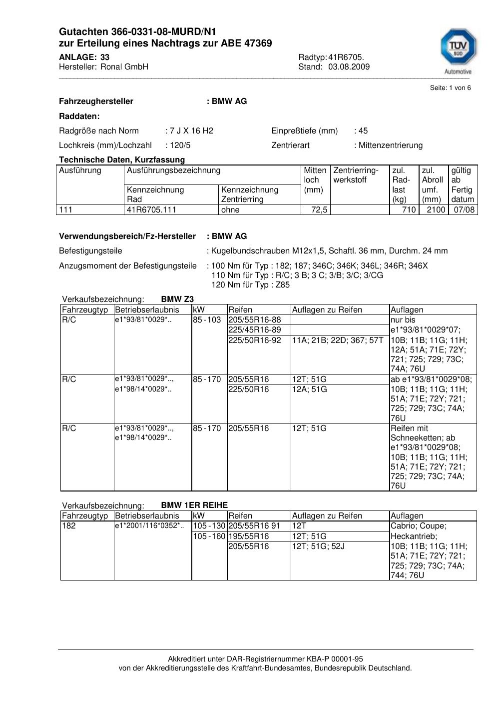 Dieses Gutachten (abe) bezieht sich auf die Alufelge Ronal 41R6705 in der Ausführung 7Jx16 ET 0, Mittenloch 0 mm (KBA 47369). Im PDF findest du typischerweise zulässige Reifengrößen, Auflagen/Anbauhinweise und – je nach Dokument – Hinweise zur Eintragung.