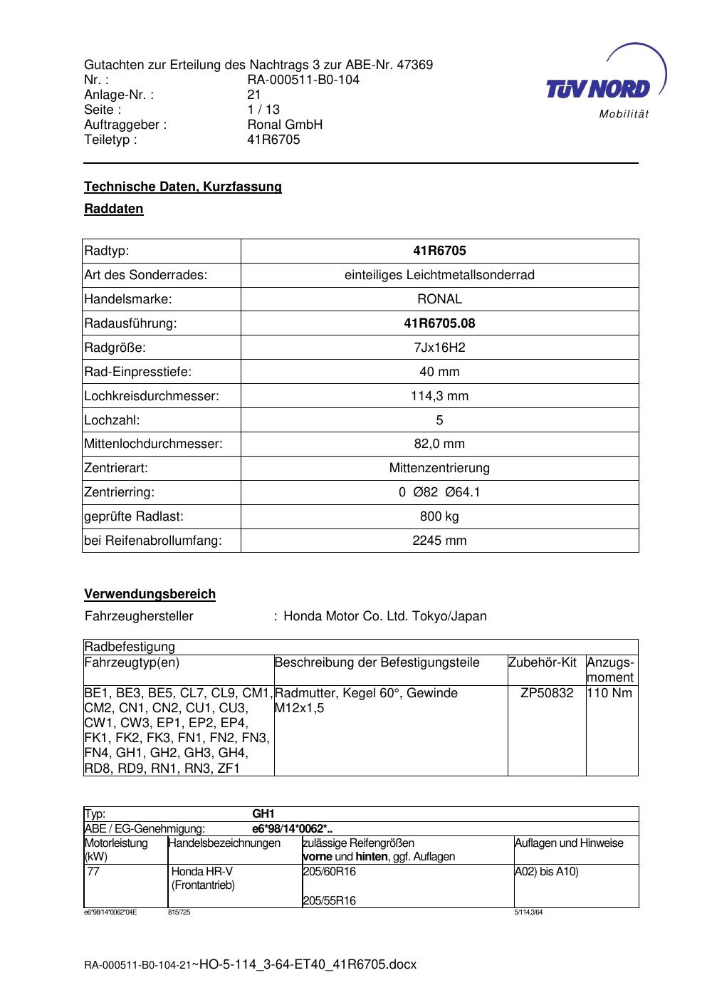 Dieses Gutachten (abe) bezieht sich auf die Alufelge brand-ronal 41R6705 in der Ausführung 7Jx16 ET 0, Mittenloch 0 mm (KBA 47369). Im PDF findest du typischerweise zulässige Reifengrößen, Auflagen/Anbauhinweise und – je nach Dokument – Hinweise zur Eintragung.