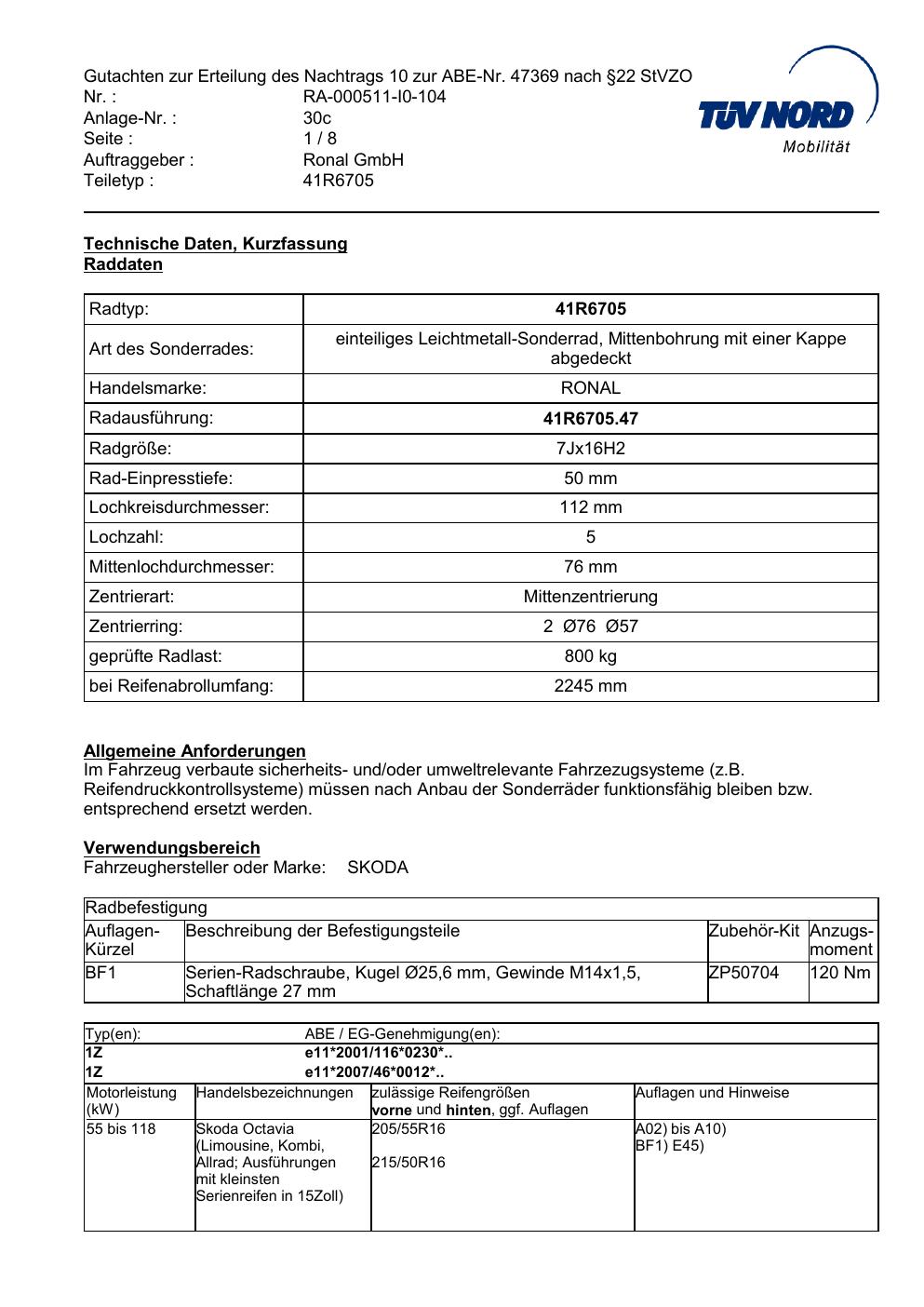 Dieses Gutachten (abe) bezieht sich auf die Alufelge brand-ronal 41R6705 in der Ausführung 7Jx16 ET 0, Mittenloch 0 mm (KBA 47369). Im PDF findest du typischerweise zulässige Reifengrößen, Auflagen/Anbauhinweise und – je nach Dokument – Hinweise zur Eintragung.