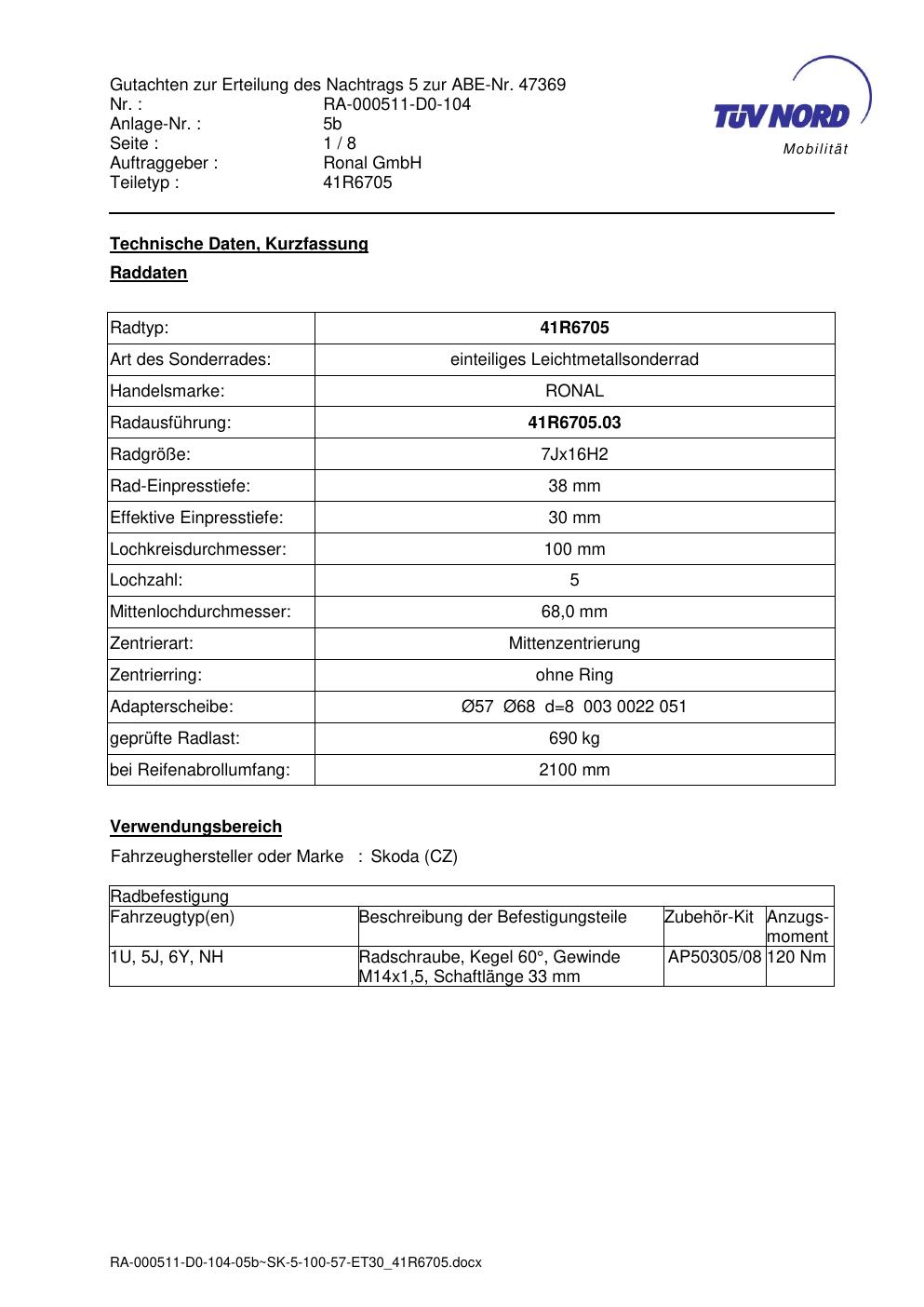 Dieses Gutachten (abe) bezieht sich auf die Alufelge brand-ronal 41R6705 in der Ausführung 7Jx16 ET 0, Mittenloch 0 mm (KBA 47369). Im PDF findest du typischerweise zulässige Reifengrößen, Auflagen/Anbauhinweise und – je nach Dokument – Hinweise zur Eintragung.