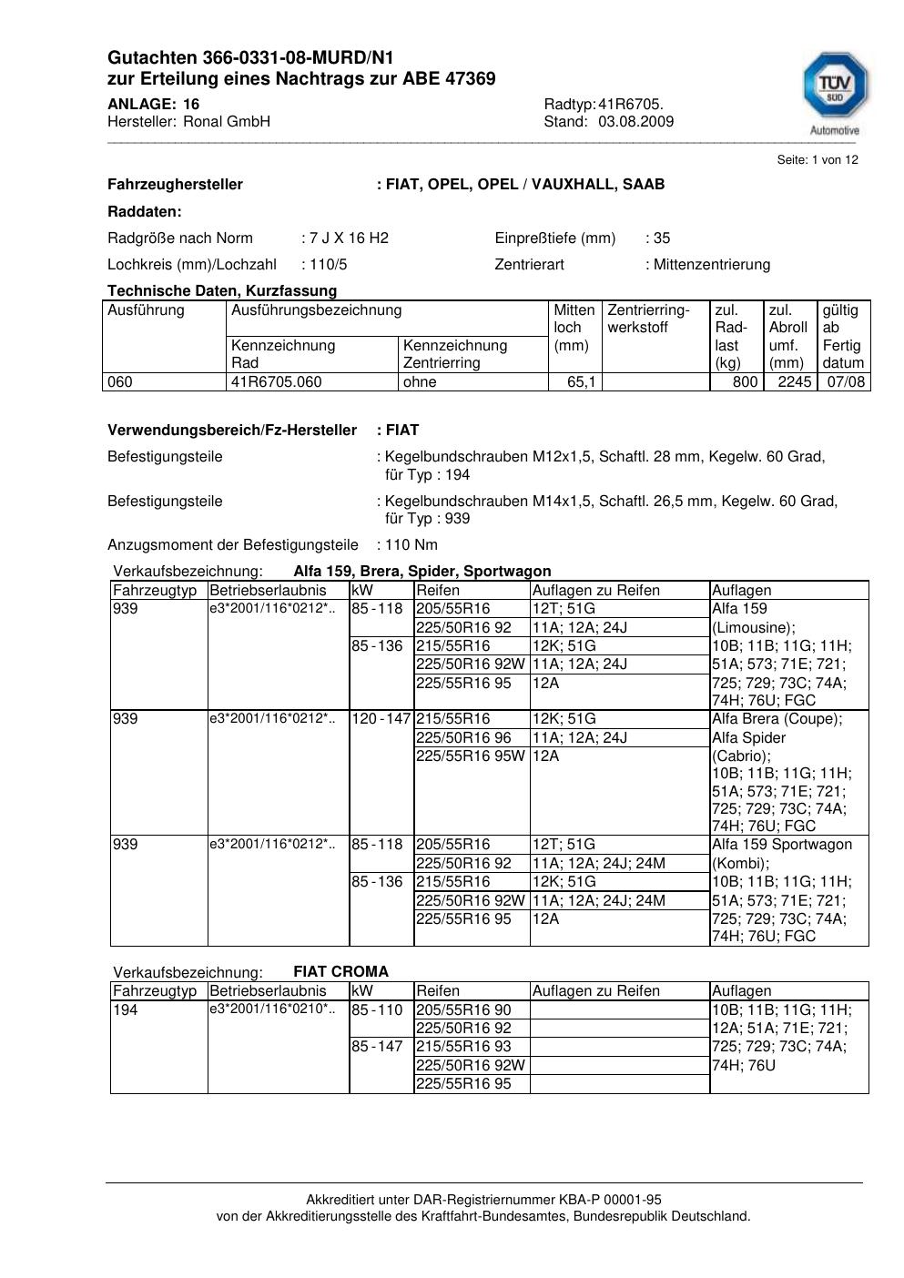 Dieses Gutachten (abe) bezieht sich auf die Alufelge Ronal 41R6705 in der Ausführung 7Jx16 ET 0, Mittenloch 0 mm (KBA 47369). Im PDF findest du typischerweise zulässige Reifengrößen, Auflagen/Anbauhinweise und – je nach Dokument – Hinweise zur Eintragung.